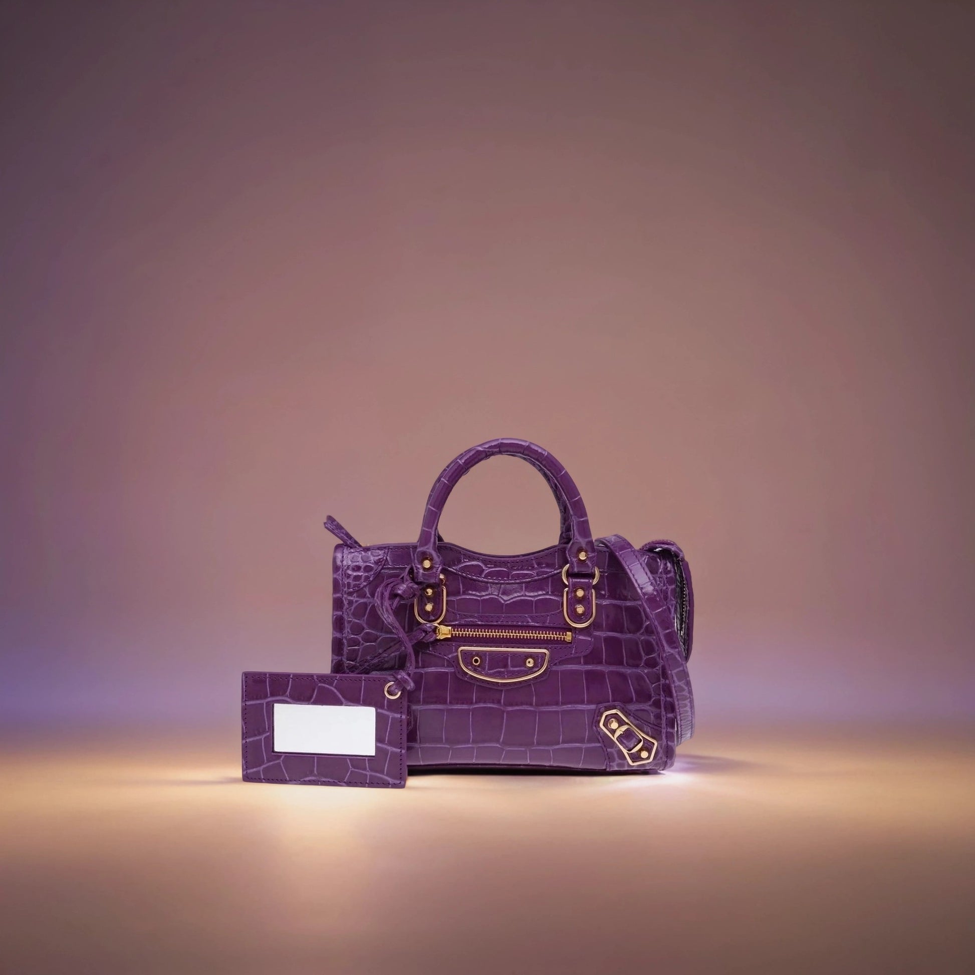 his is an authentic BALENCIAGA Shiny Supple Calfskin Crocodile Embossed Gold Metallic Edge Hardware Nano City in Purple . This stylish tote is crafted of richly textured crocodile embossed leather in blue. The bag features hand-stitched rolled leather top handles, an optional crossbody shoulder strap, an exterior zipper pocket, and gold hardware. The top zipper opens to a black fabric interior with a flat pocket.