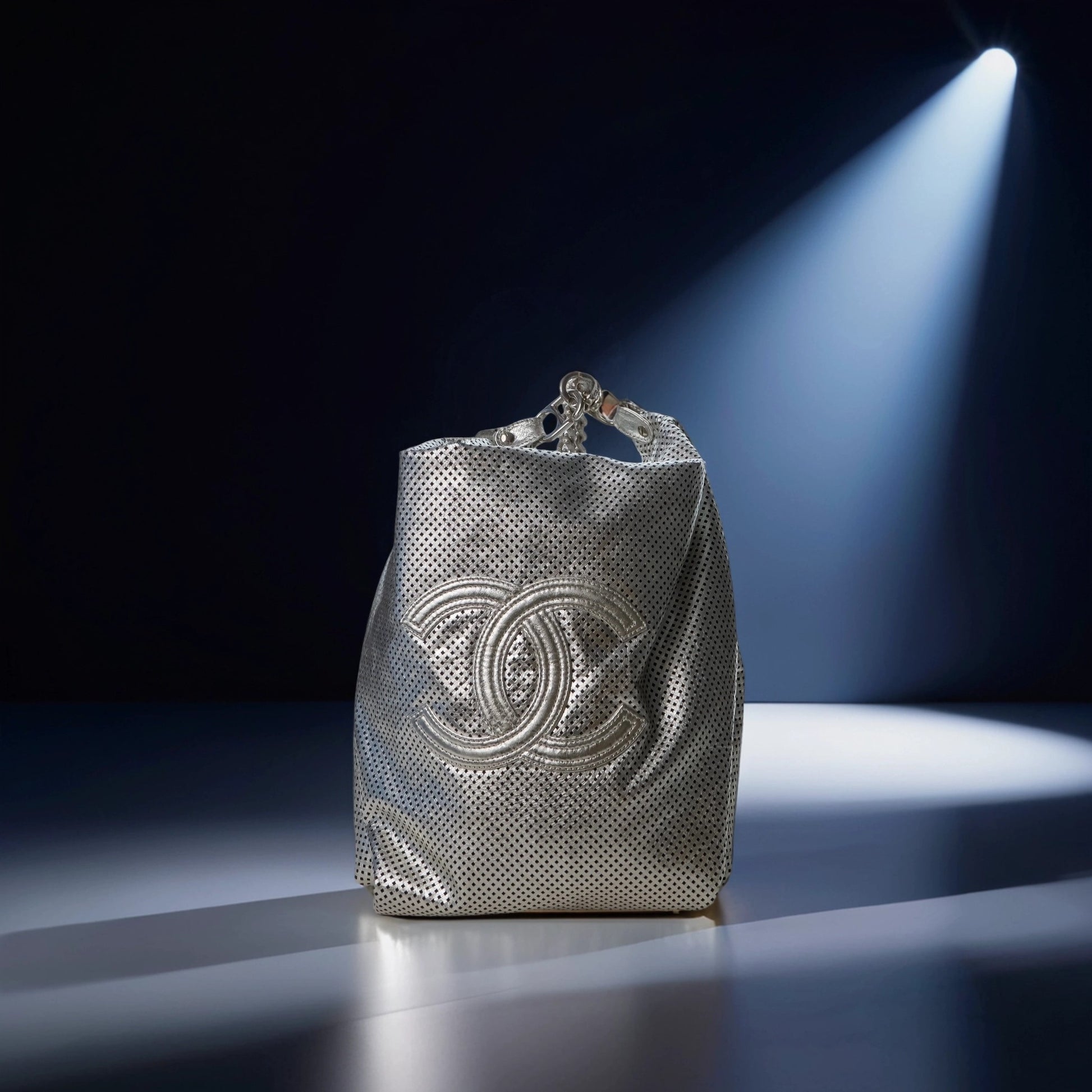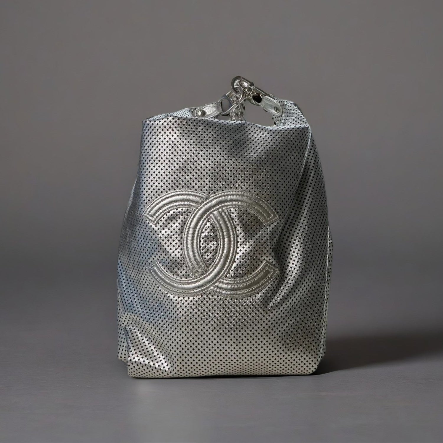 This is an authentic CHANEL Metallic Crackled Perforated Calfskin XL Rodeo Drive Tote in Silver. This tote is crafted of silver metallic calfskin leather that is uniformly perforated, sporting a large stitched Chanel CC logo. The bag can be carried by the silver chain handles or the optional silver leather shoulder strap. The top opens to a gray satin interior with a zipper pocket.