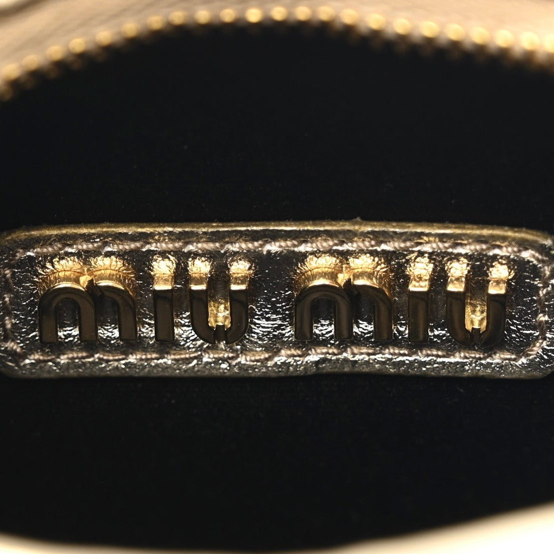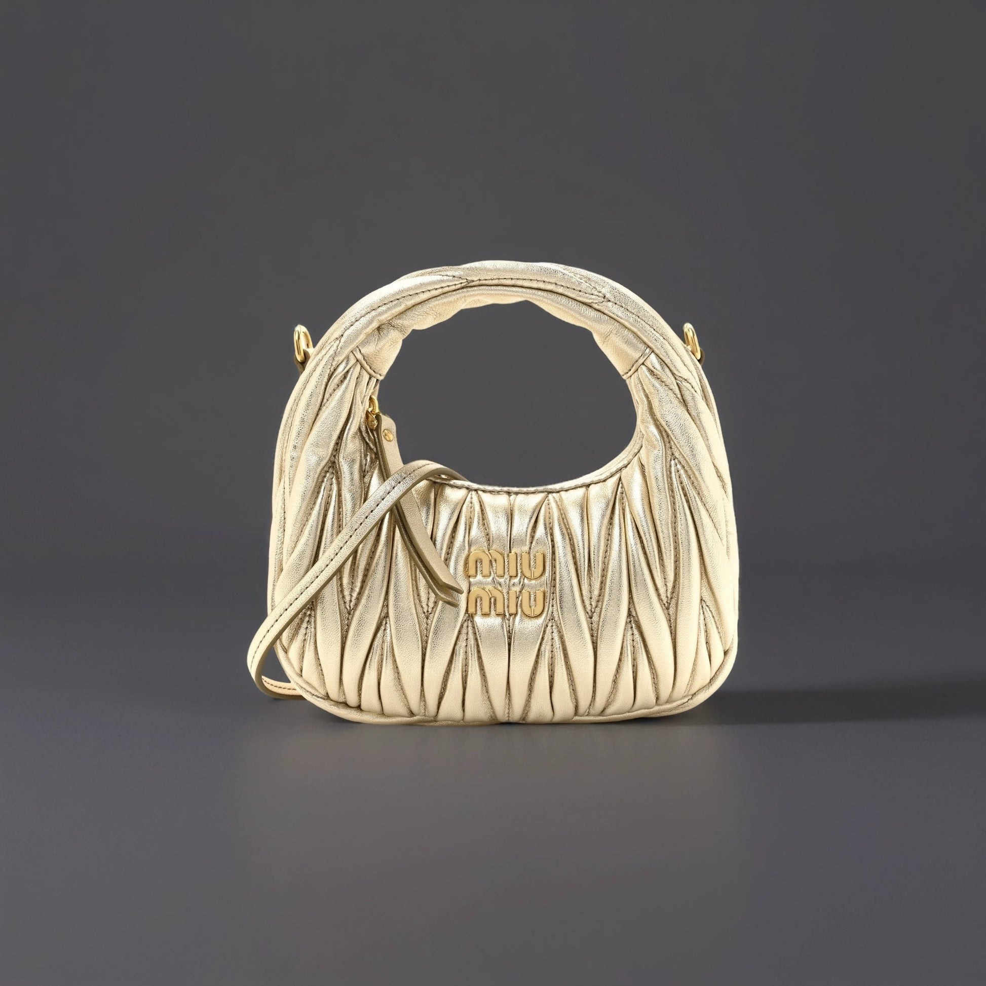 This an authentic MIU MIU Nappa Matelasse Mini Wander Hobo in Pirite. This chic baguette is crafted of matelasse pleated lambskin nylon in gold. This handbag features a matching looping top handle and a detachable shoulder strap. The top zipper opens to a black fabric interior.