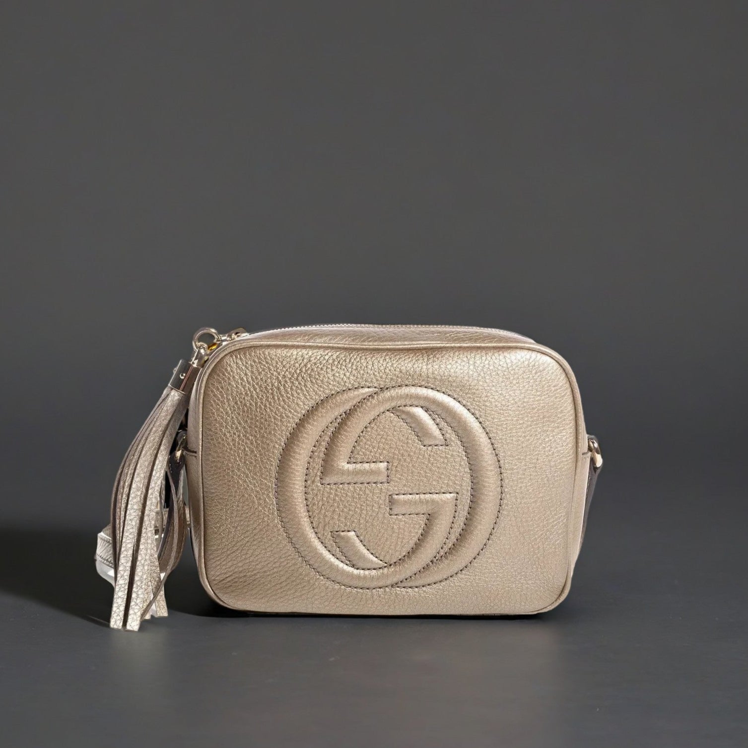 We guarantee this is an authentic GUCCI Metallic Pebbled Calfskin Small Soho Disco Bag Golden Beige. This stylish crossbody bag is crafted of fine leather. The bag features a leather adjustable cross body shoulder strap and a prominent frontal stitched interlocking GG logo with a light brass knobbed leather tassel zipper pull which opens to a natural fiber interior with patch pockets. This is a stylish bag for day or disco with the sophisticated style from Gucci.