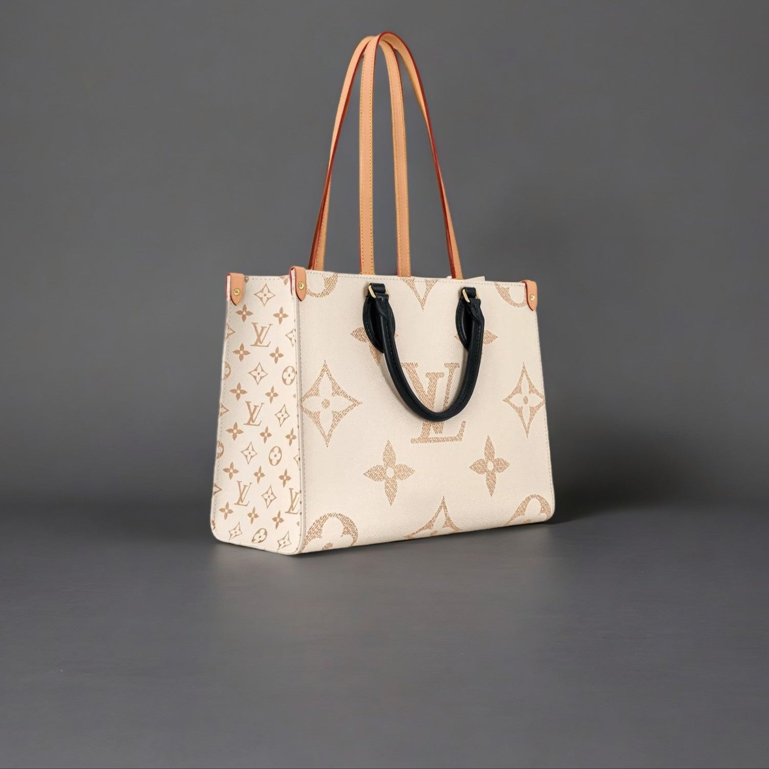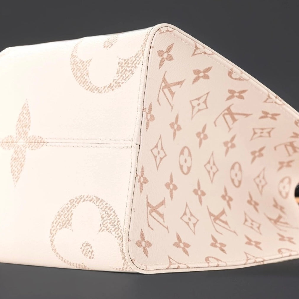 This authentic LOUIS VUITTON Monogram Giant Spring In The City OnTheGo MM is crafted of oversized monogram embossed coated canvas. It features rolled leather top handles, long strap handles, gold-tone hardware and opens to a spacious beige monogram fabric interior with a zipper and patch pockets.