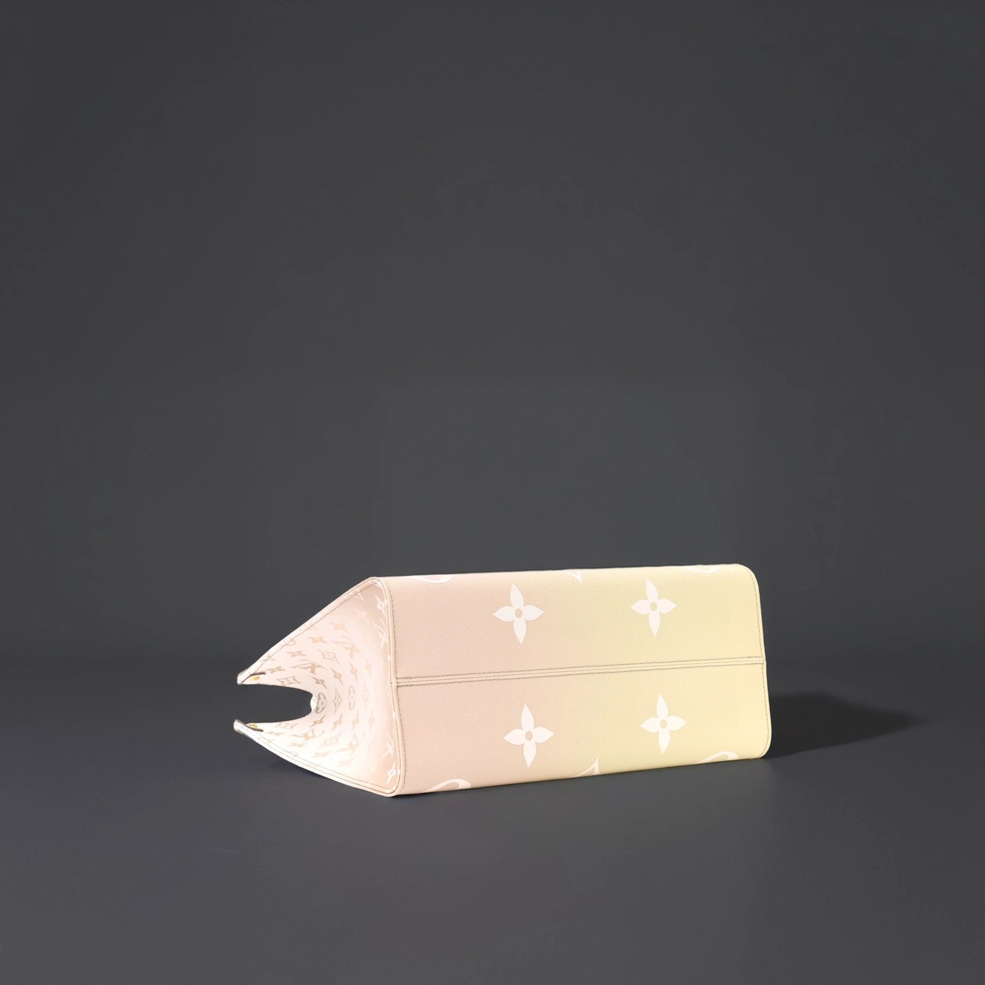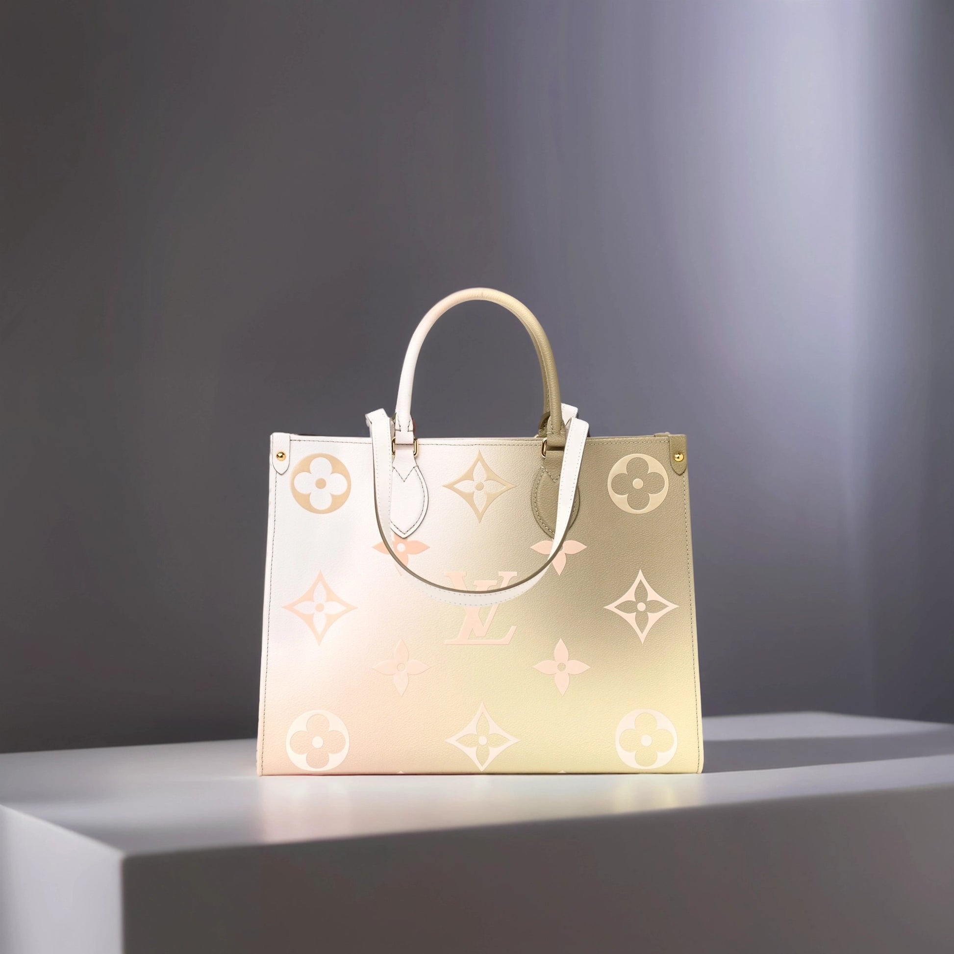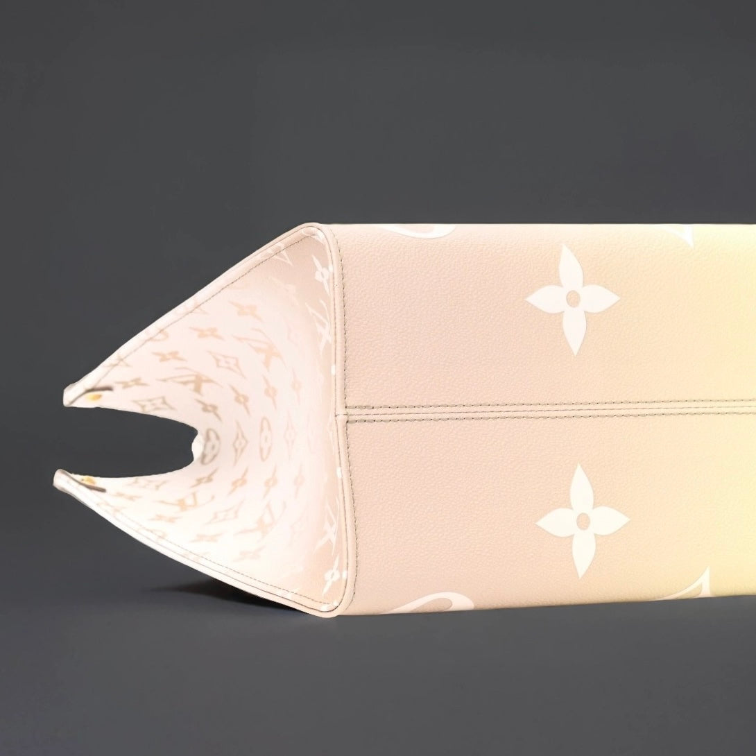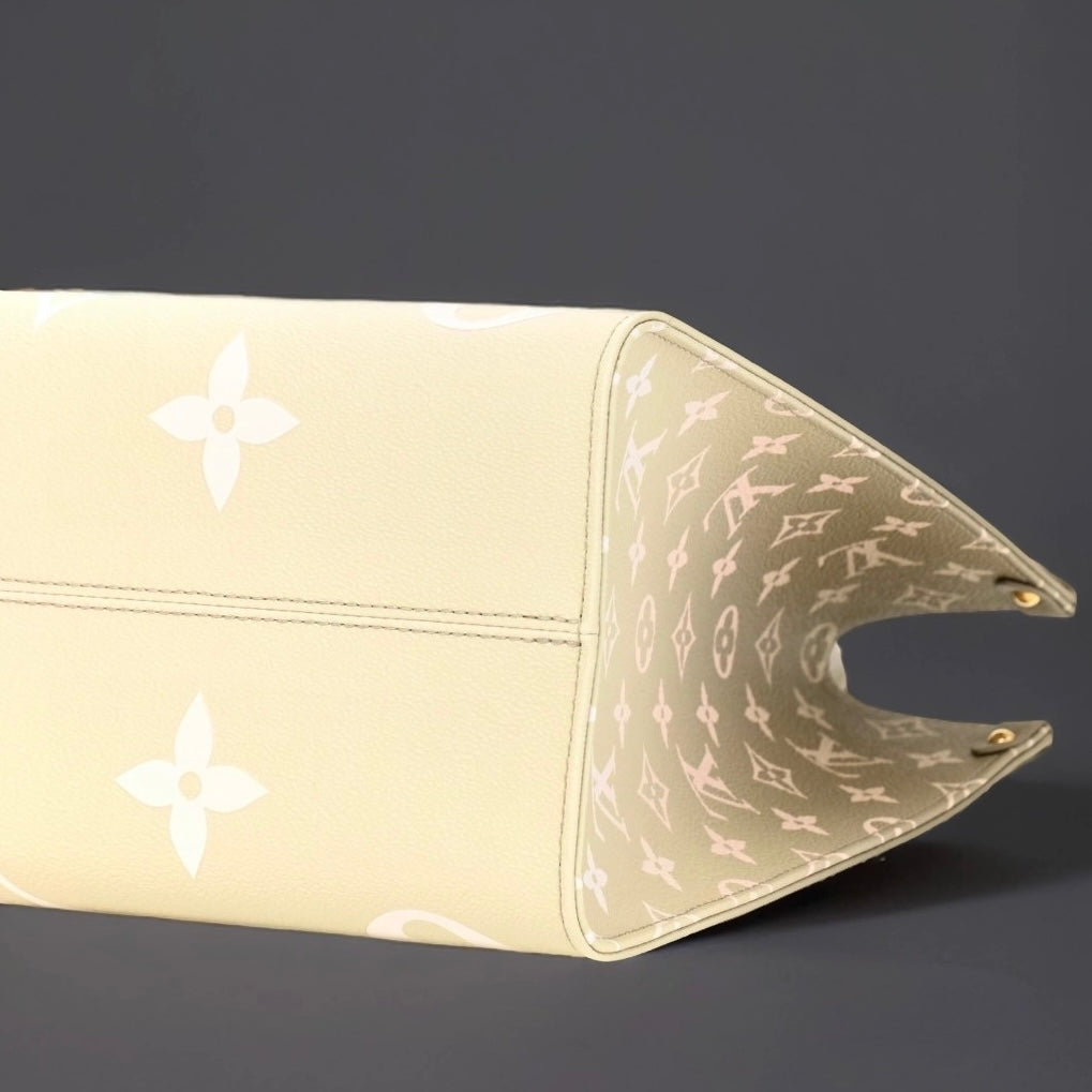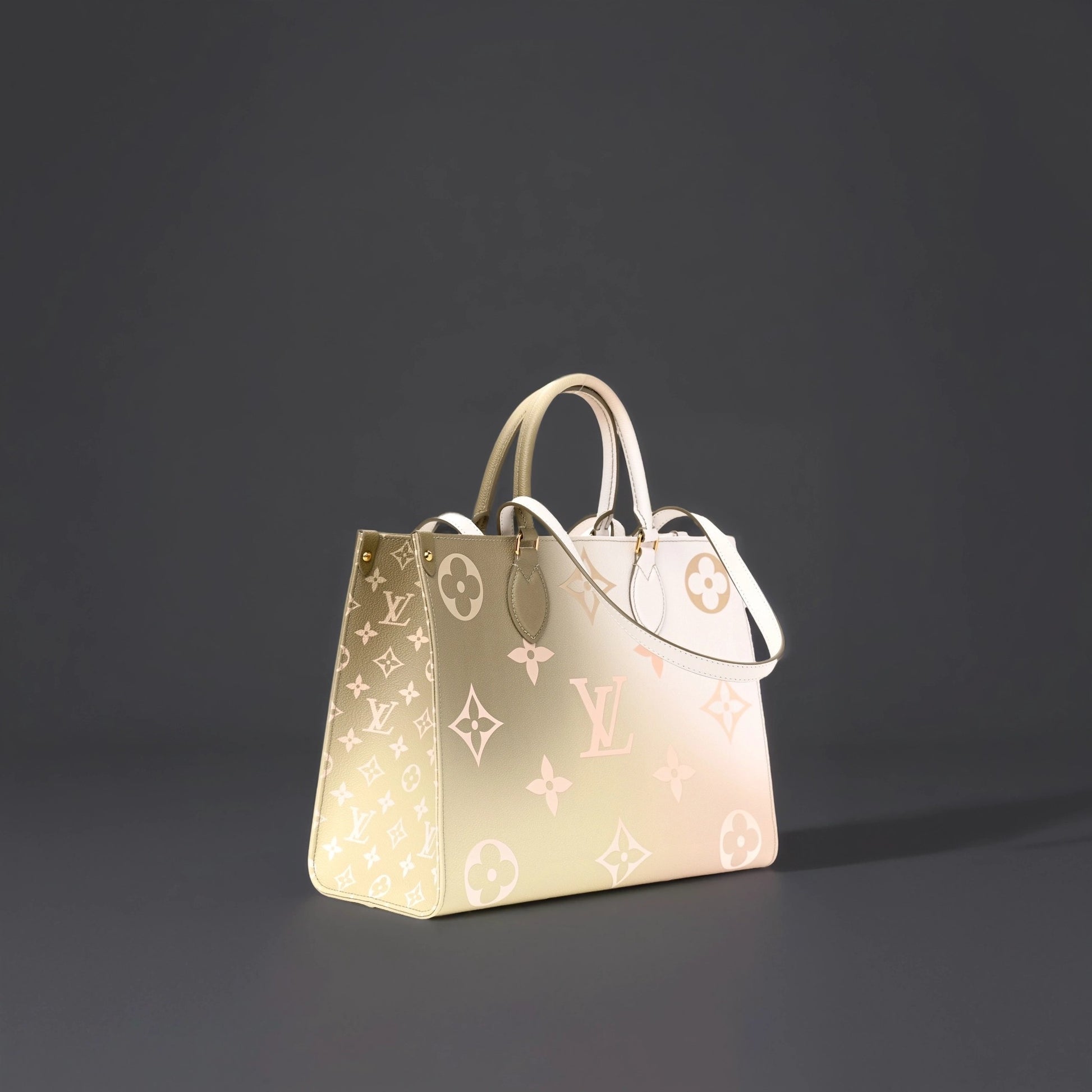 This is an authentic LOUIS VUITTON Monogram Giant Spring In The City OnTheGo MM in Sunset Kaki. This pre-owned luxury tote is part of the Louis Vuitton Spring 2022 “Spring in the City” collection. This limited edition tote is crafted of oversized Louis Vuitton monogram print embossed on ombre green coated canvas. The bag features rolled leather top handles, long strap handles, and gold-tone hardware. The top opens to a spacious white LV monogram fabric interior that has a zipper and two patch pockets. The top can be secured across with a snap strap inlay. The Louis Vuitton OnTheGo MM can be carried by hand, in the crook of the arm, or over the shoulder with the straps. This is the perfect everyday tote, only from Louis Vuitton!