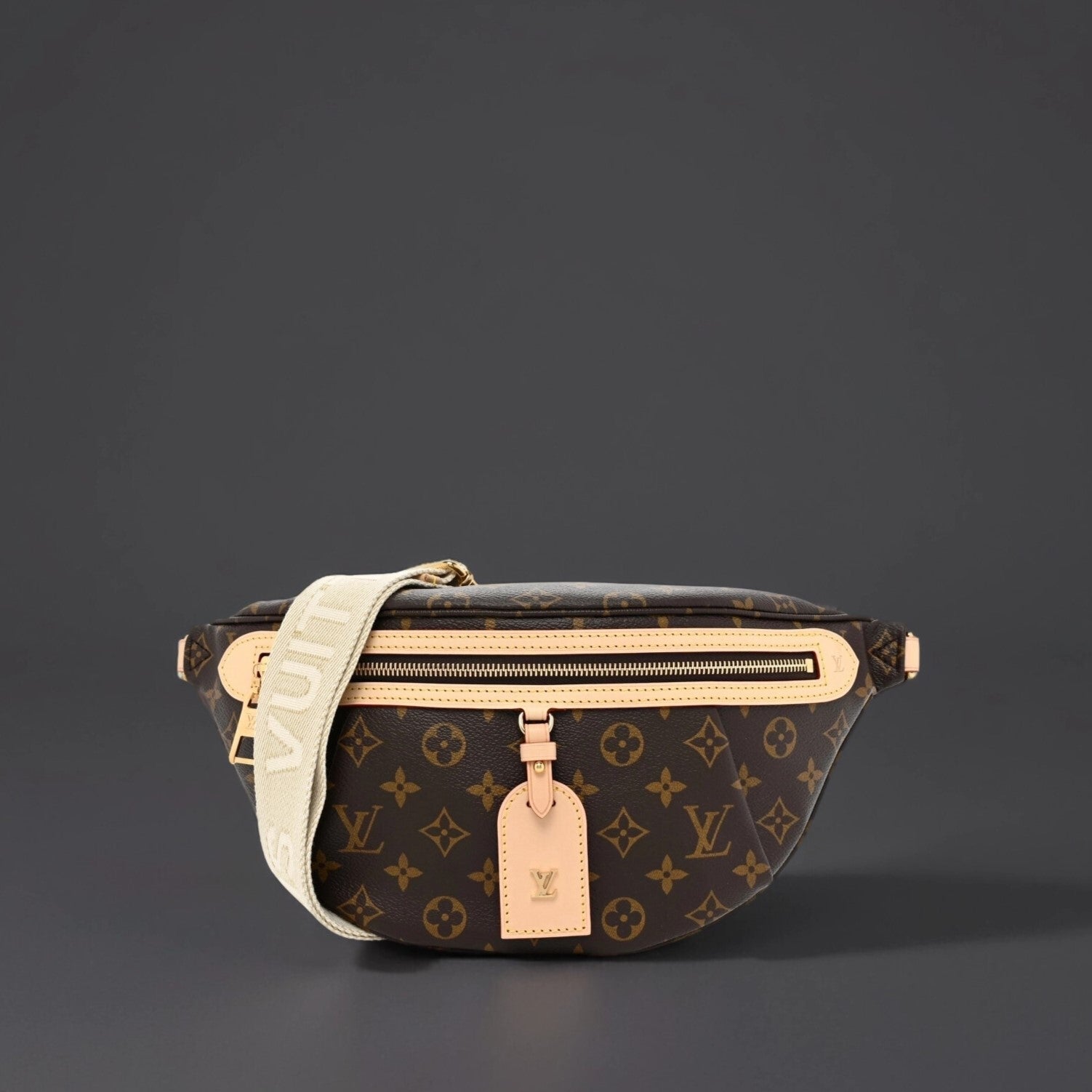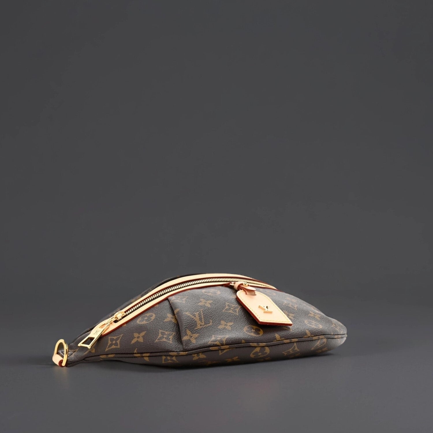 This is an authentic LOUIS VUITTON Monogram High Rise Bumbag. This belt bag is crafted of Louis Vuitton monogram coated canvas in brown with vachetta leather accents including zipper tape and a removable luggage tag. The bag features a front zipper pocket, a rear zipper pocket, and an adjustable beige fabric strap stitched with "Louis Vuitton". The main zipper opens to a white monogram fabric interior.