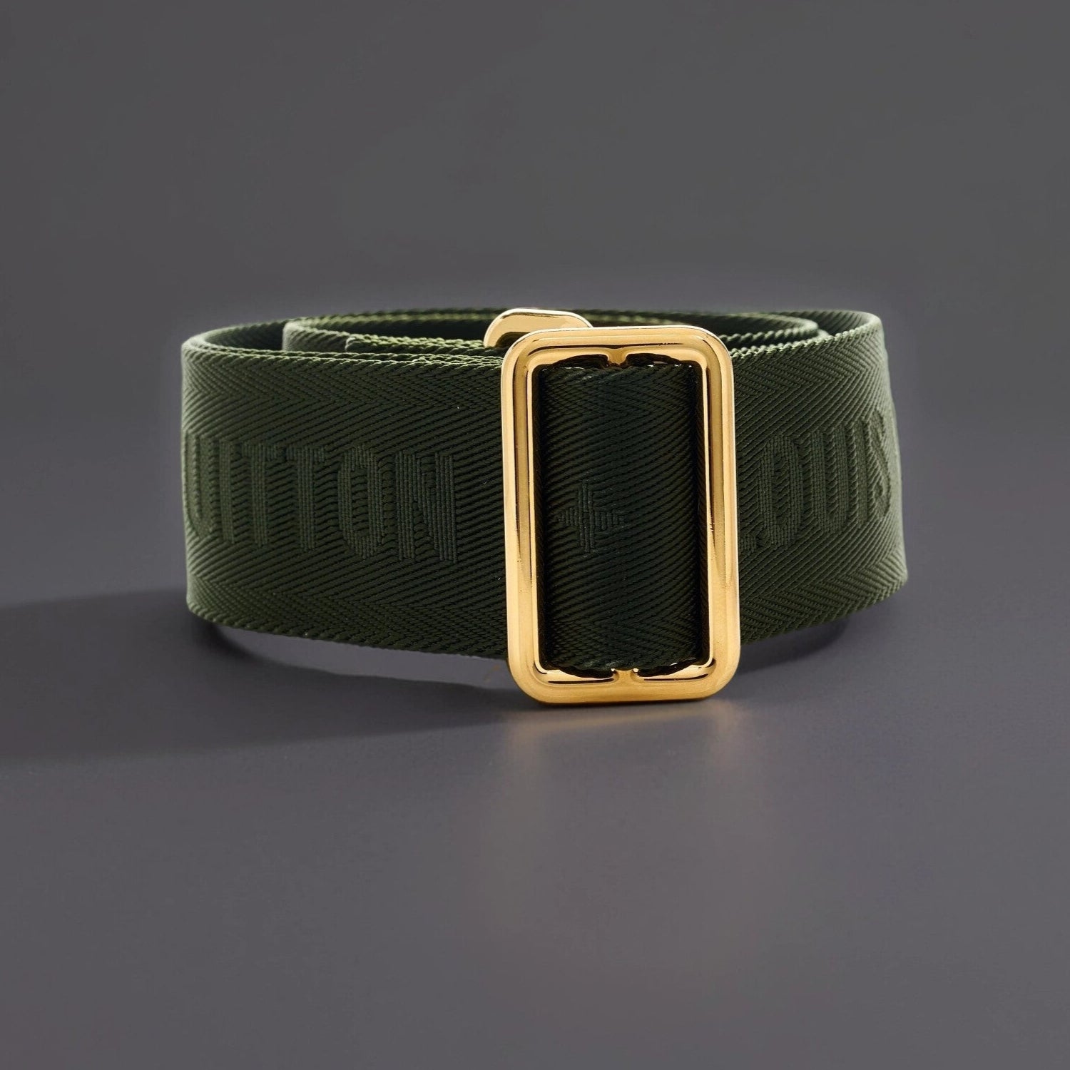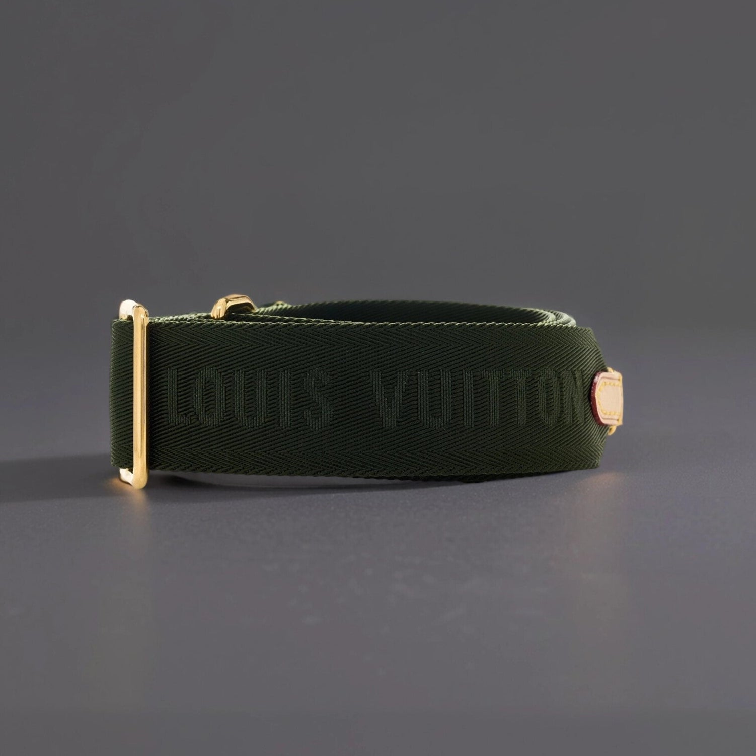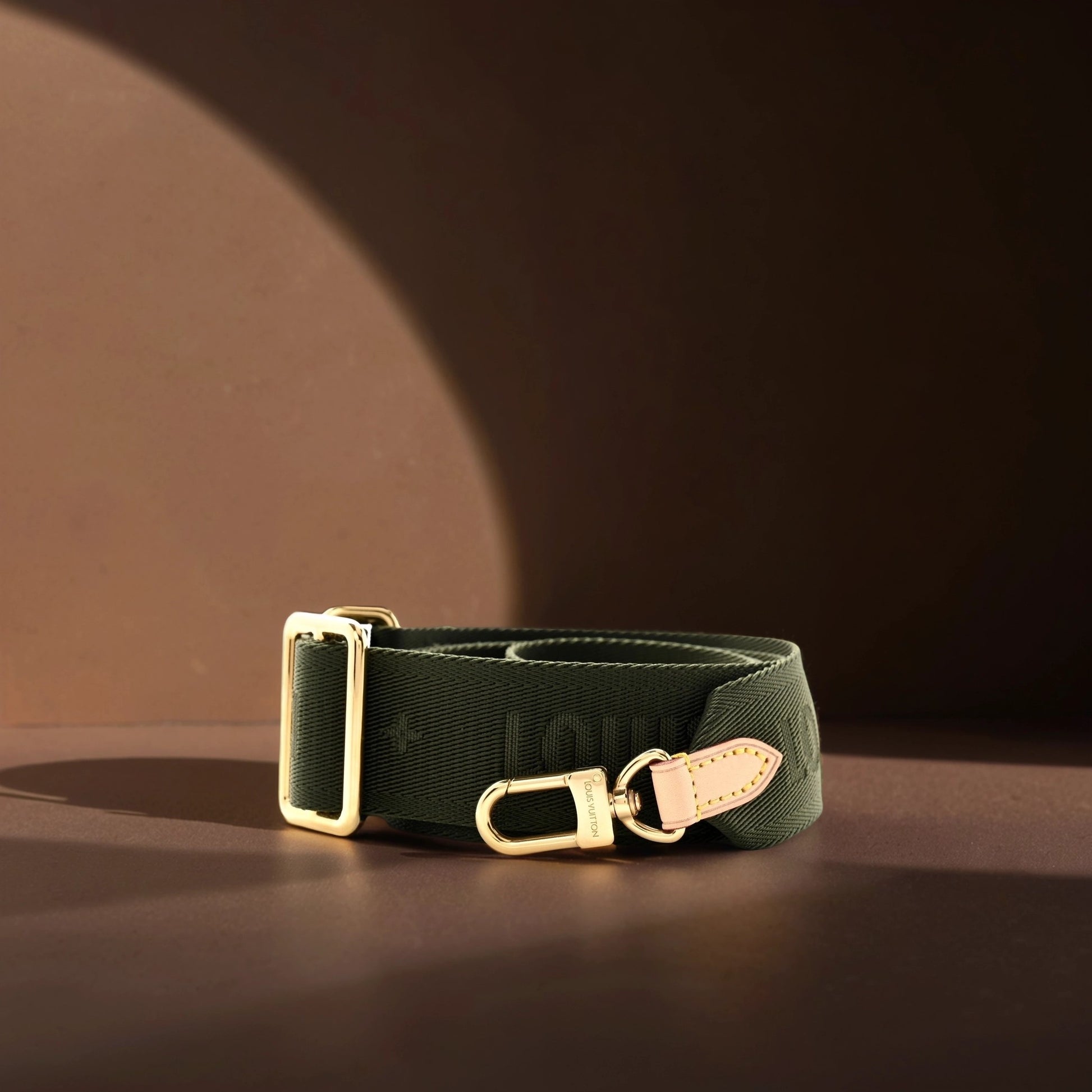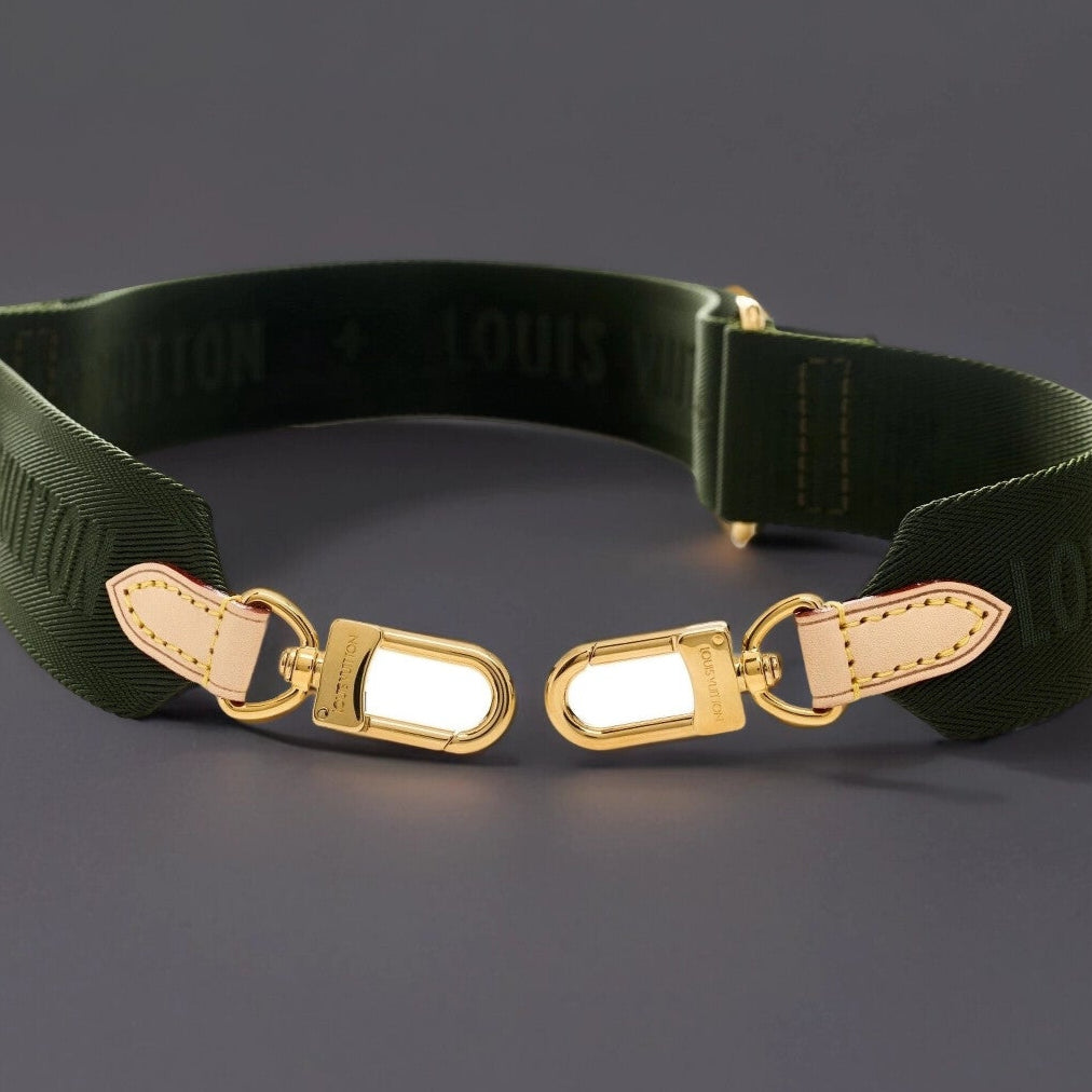 This is an authentic LOUIS VUITTON Monogram New Wave Multi Pochette Accessories Shoulder Strap in Khaki. This adjustable strap is crafted of olive green nylon with the Louis Vuitton Paris logo throughout. The strap has vachetta cowhide leather trim and brass D-ring clasps to attach to your favorite Louis Vuitton handbag.