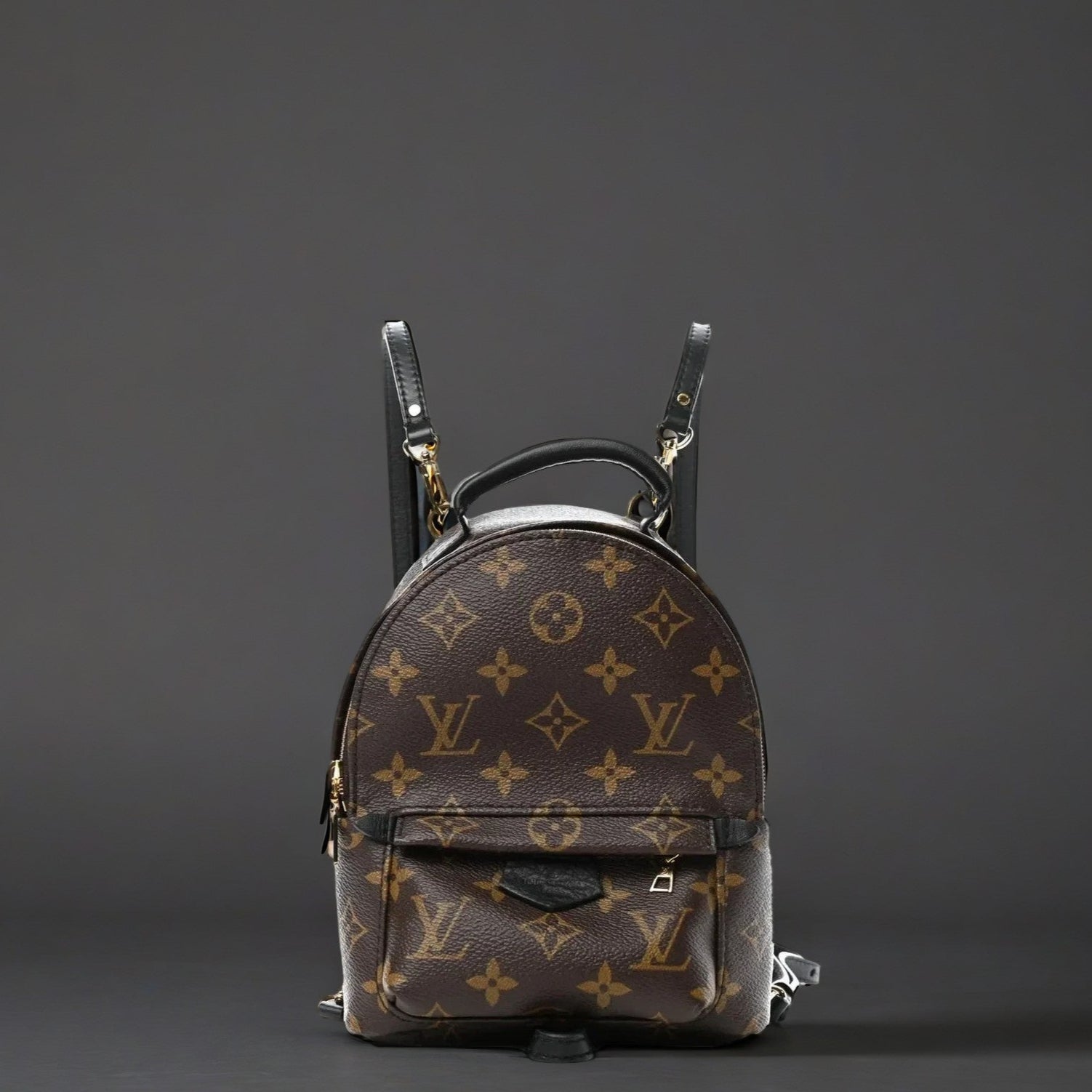 We guarantee this is an authentic LOUIS VUITTON Monogram Palm Springs Backpack Mini. This petite backpack features a body of sturdy monogram coated canvas with a black calfskin trim and a front zipped pocket. The backpack is reinforced with strong cowhide leather including a handle and adjustable leather shoulder straps. The top zipper opens to a black nylon fabric interior with a patch pocket.