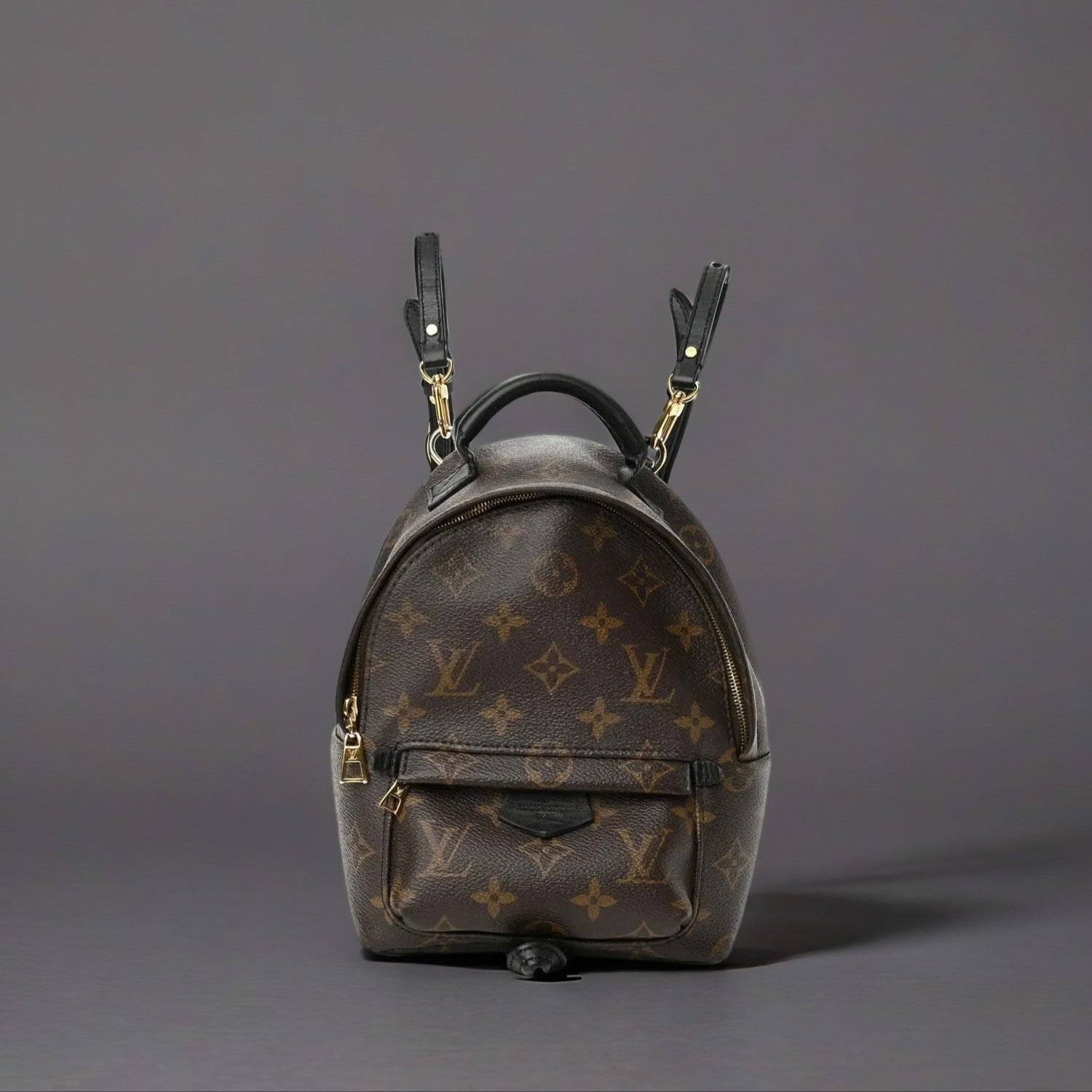 This is the authentic LOUIS VUITTON Monogram Palm Springs Backpack Mini. This petite backpack is crafted of classic monogram coated canvas, with black calfskin leather trim. The backpack features a padded black leather top handle, removable adjustable shoulder straps, and a front zipper pocket. The brass wrap-around zipper opens to a black fabric interior with a patch pocket.