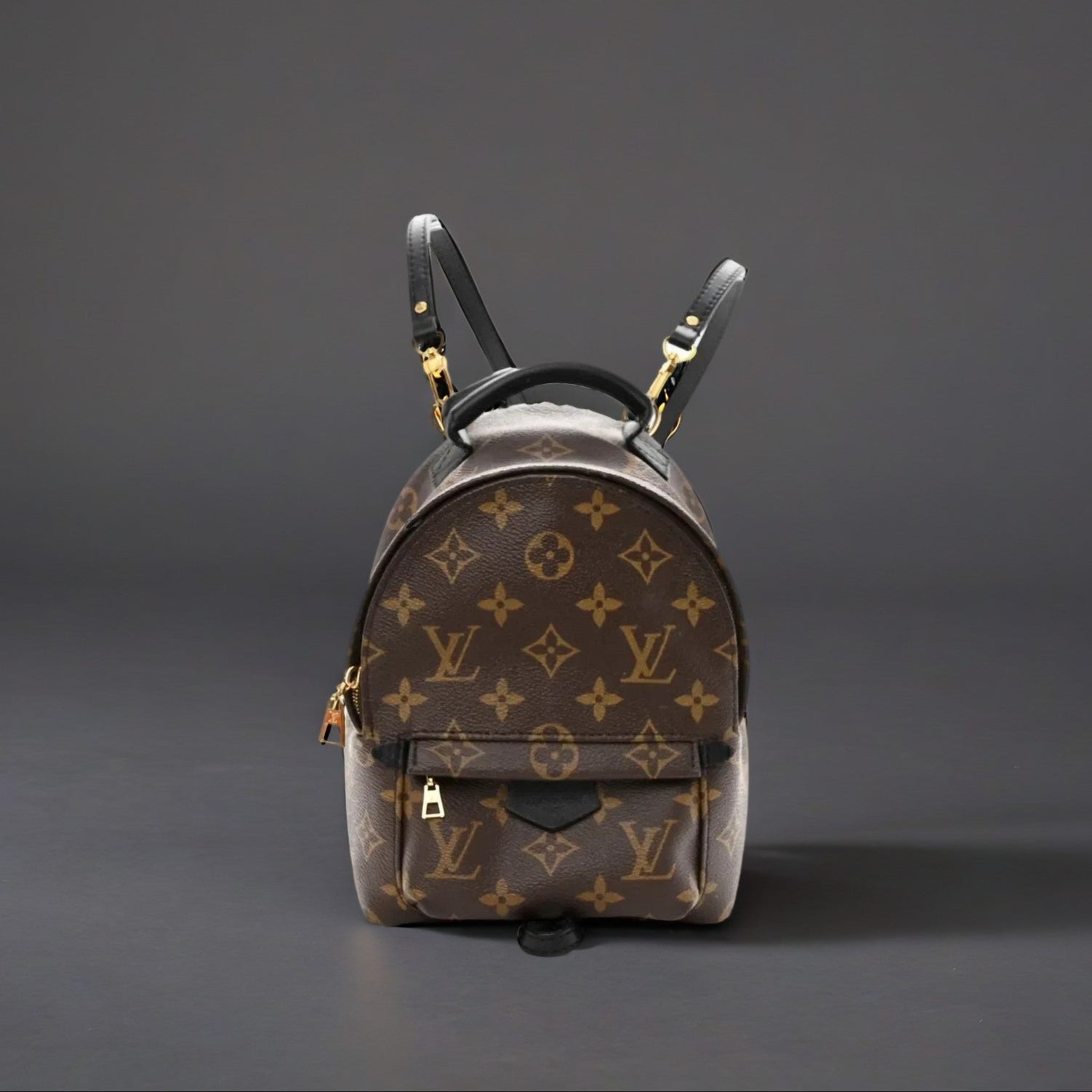 This is the authentic LOUIS VUITTON Monogram Palm Springs Backpack Mini. This petite backpack is crafted of classic monogram coated canvas, with black calfskin leather trim. The backpack features a padded black leather top handle, optional adjustable shoulder straps, and a front zipper pocket. The brass wrap-around zipper opens to a black fabric interior with a patch pocket.
