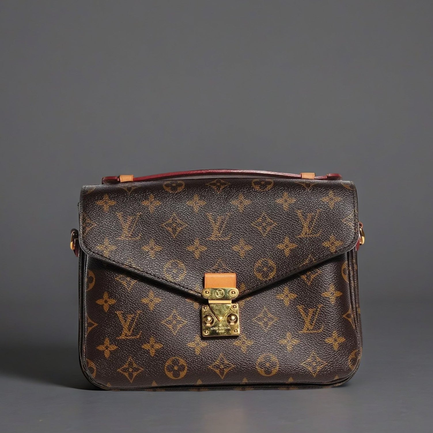 This is an authentic used LOUIS VUITTON Monogram Pochette Metis. This handbag is crafted of classic dark brown and gold Louis Vuitton monogram on toile canvas. The bag features a monogram canvas cross-body strap, a top handle of natural vachetta cowhide leather, an exterior zipper pocket on the rear, and a envelope flap with a brass S-lock. The flap opens to a partitioned brown microfiber interior with pockets. This is an ideal everyday messenger bag, from Louis Vuitton.
