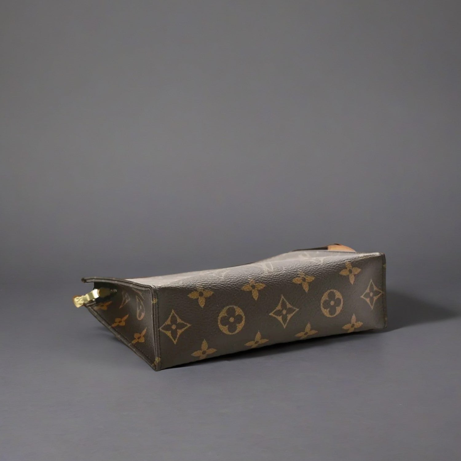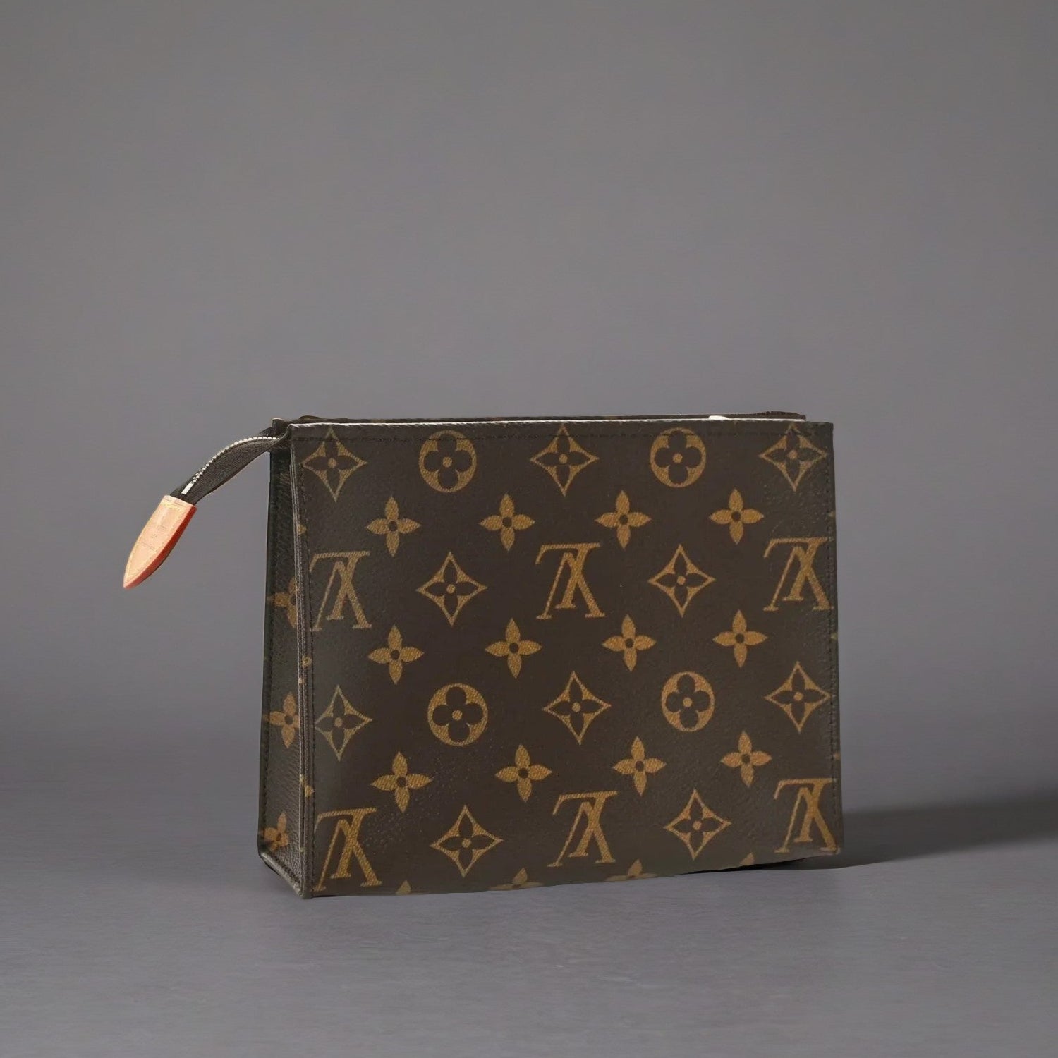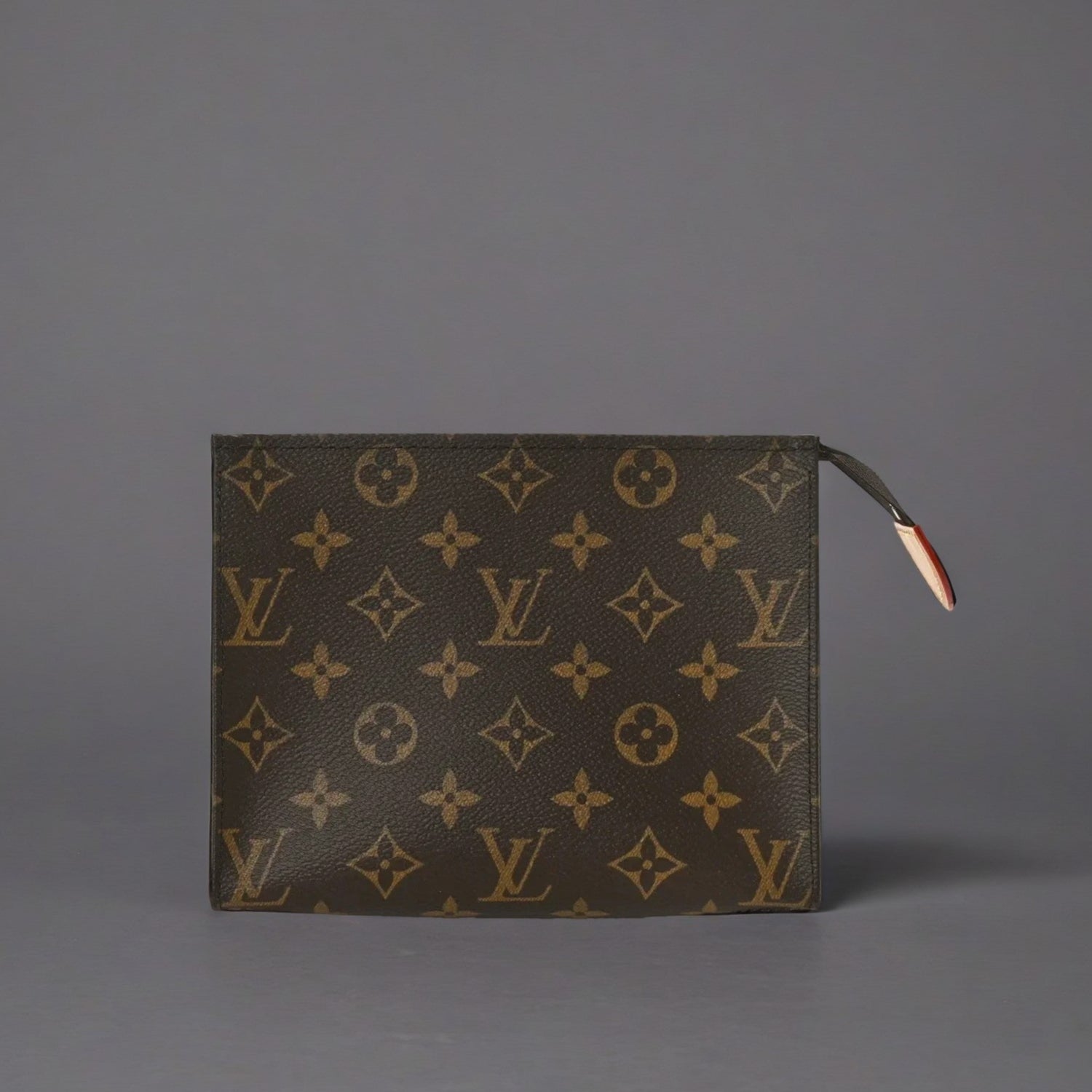 This is an authentic LOUIS VUITTON Monogram Toiletry Pouch 19. This small cosmetic pouch is crafted of classic Louis Vuitton monogram coated canvas in brown. The pouch features a polished brass top zipper that opens to a beige leather-like interior.