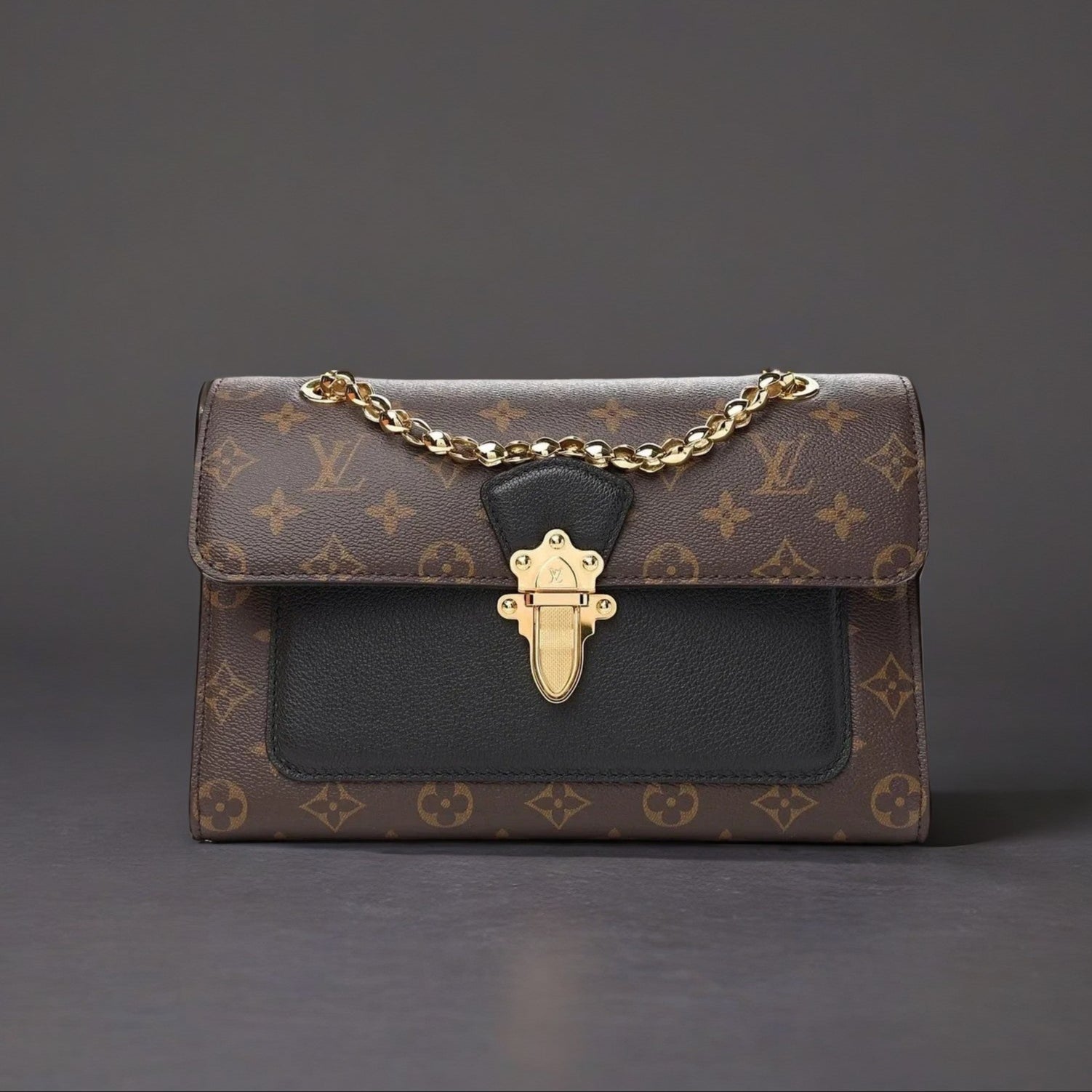 We guarantee this is an authentic LOUIS VUITTON Monogram Victoire Black. This chic shoulder bag is crafted of Louis Vuitton monogram on toile canvas with a cross-over flap. The bag features polished brass bijoux chain link shoulder straps and a facing brass press-lock for the flap. The flap opens to a front patch pocket and a partitioned black microfiber interior with a zipper compartment.