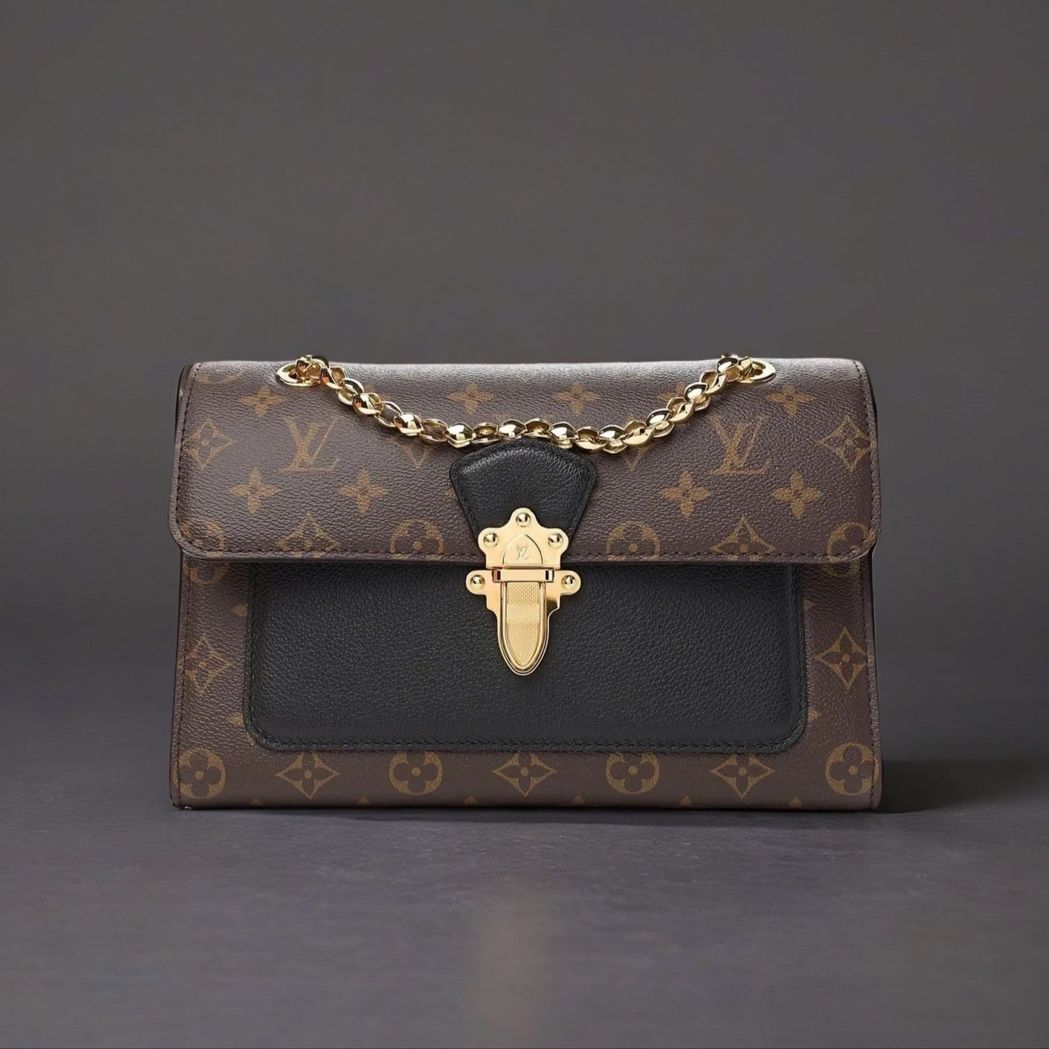This is an authentic LOUIS VUITTON Monogram Victoire in Black. This chic shoulder bag is crafted of Louis Vuitton monogram on toile canvas with a cross-over flap. The bag features polished brass bijoux chain link shoulder straps and a facing brass press-lock for the flap. The flap opens to a front patch pocket and a partitioned black microfiber interior with a zipper compartment and enough room for day or evening essentials, with the luxury and style of Louis Vuitton.