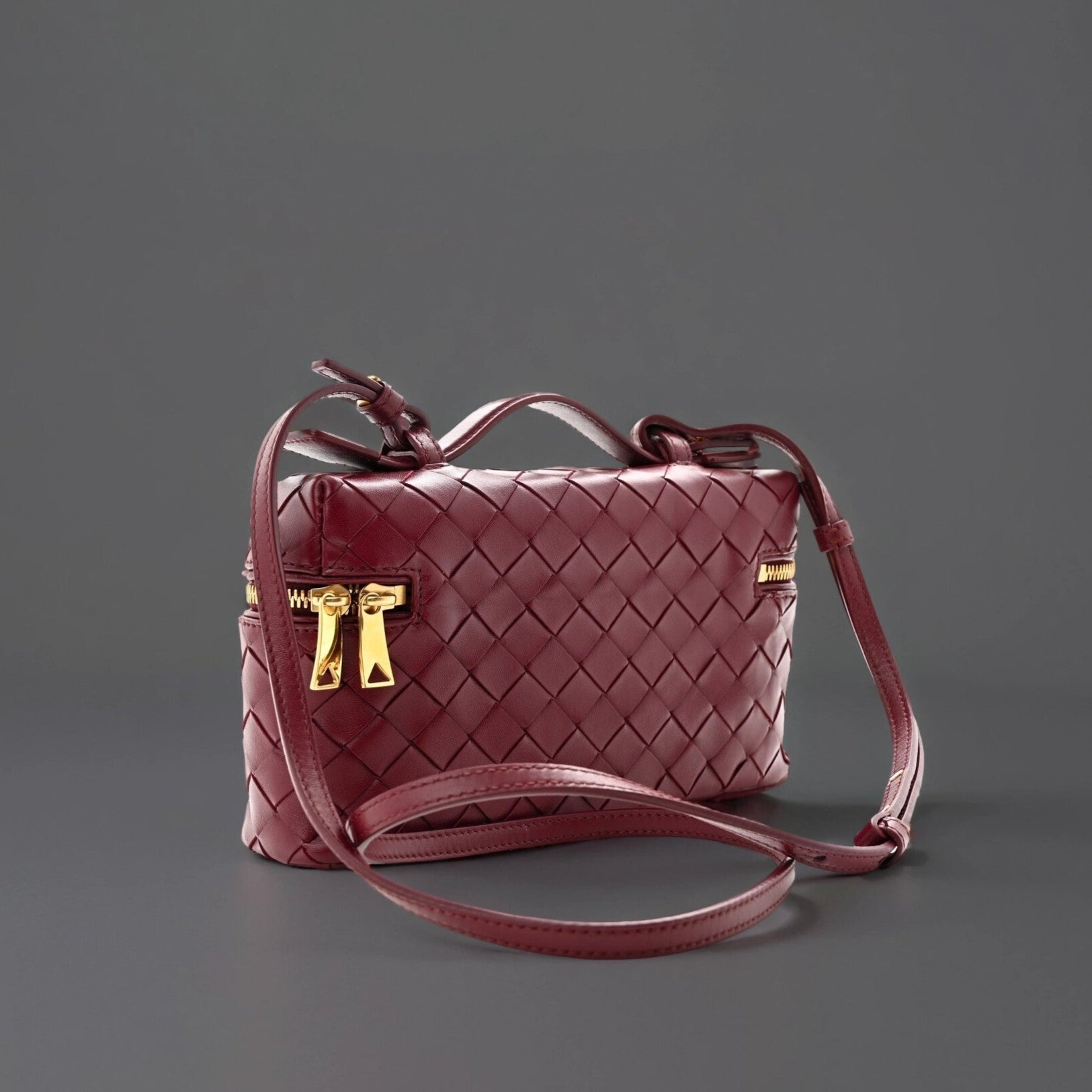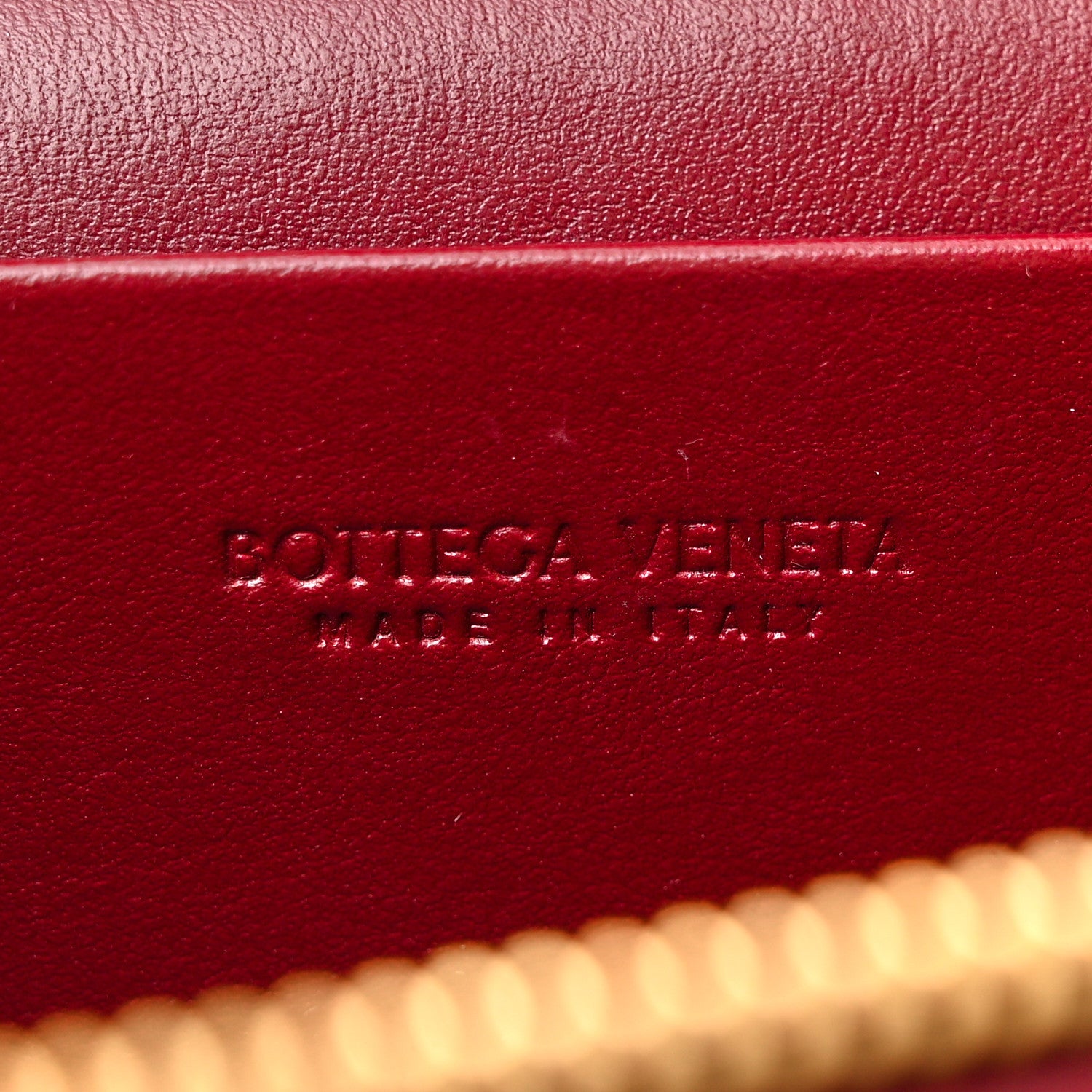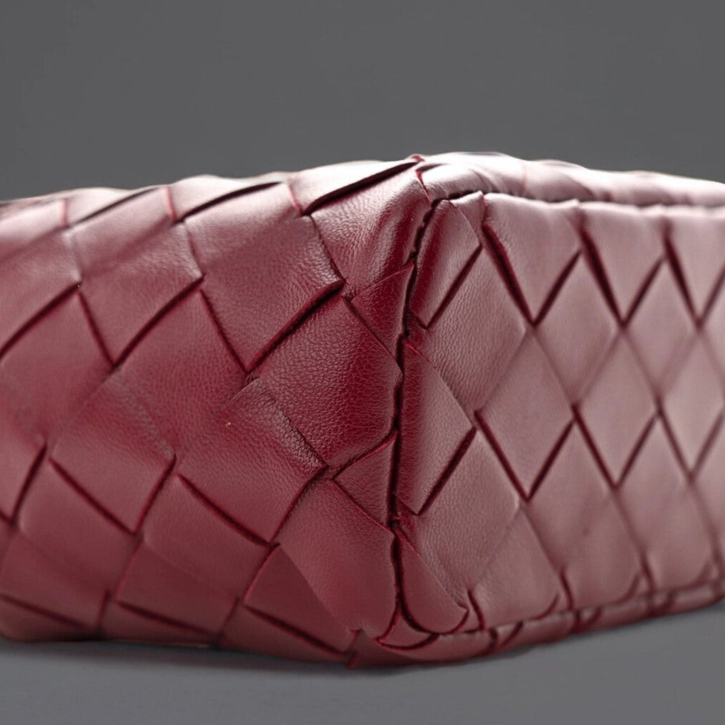 This is an authentic BOTTEGA VENETA Nappa Intrecciato Bang Bang Vanity Case in Cherry. This stylish bag is crafted of burgundy nappa leather. It features a leather top handle, a optional leather shoulder strap, and gold hardware. The flap opens to a leather interior with a patch pocket.