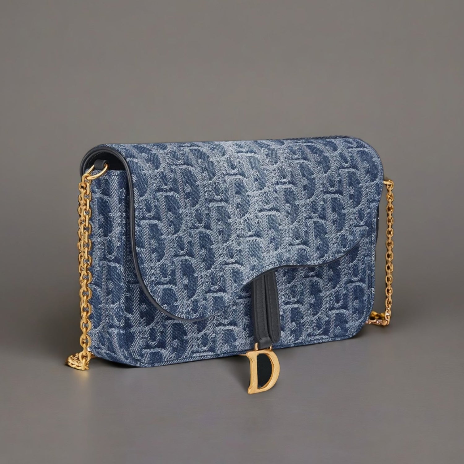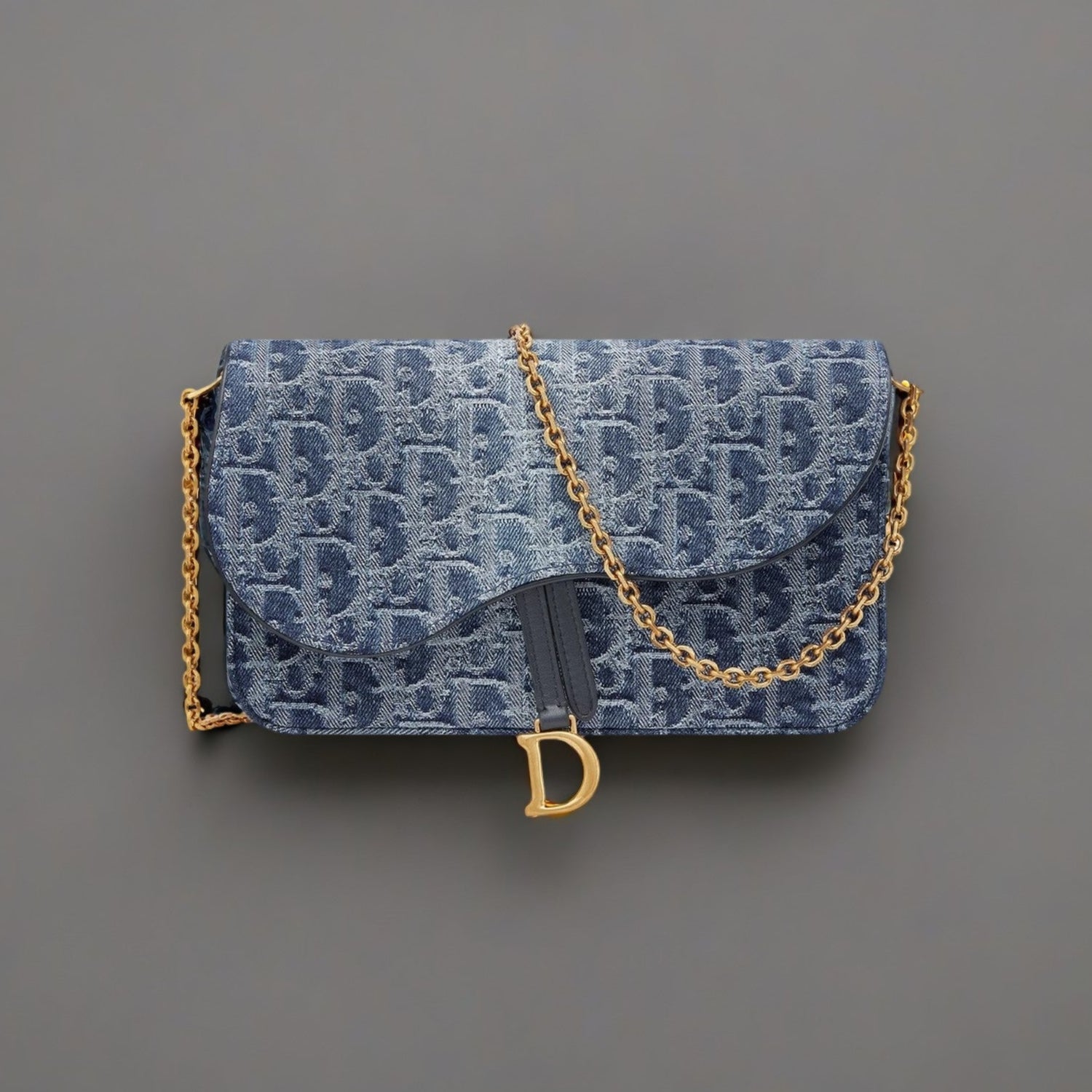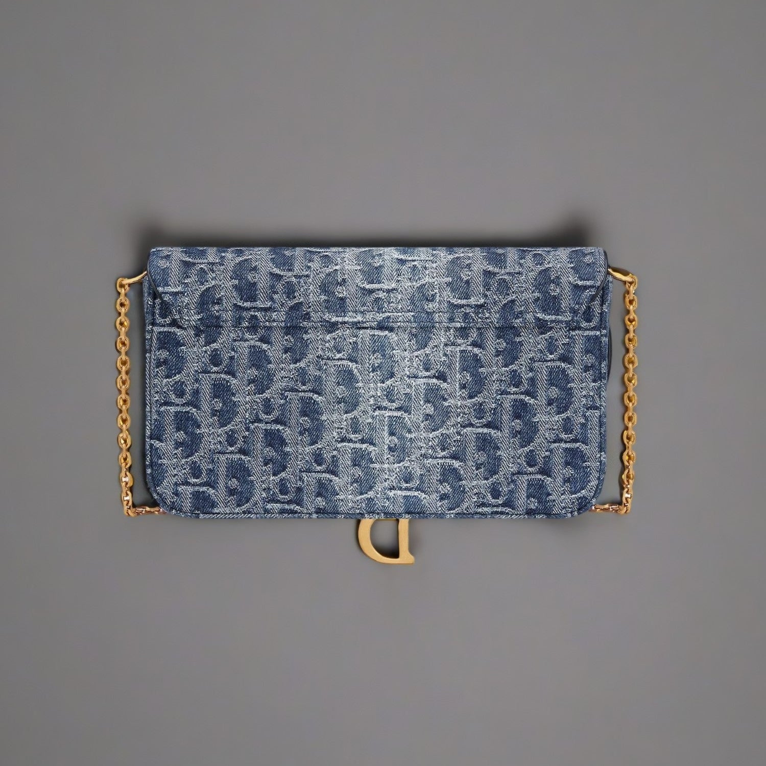 This is an authentic CHRISTIAN DIOR Oblique Saddle Chain Long Wallet in Blue Denim. This stylish wallet is crafted of blue on Denim with the modern appeal of an irregular stonewashed effect . The wallet features a saddle-style crossover flap with a brass Dior D charm and a matching optional chain-link shoulder strap. The bag opens to a blue leather and fabric interior with card slots, patch pockets, and a removable insert.