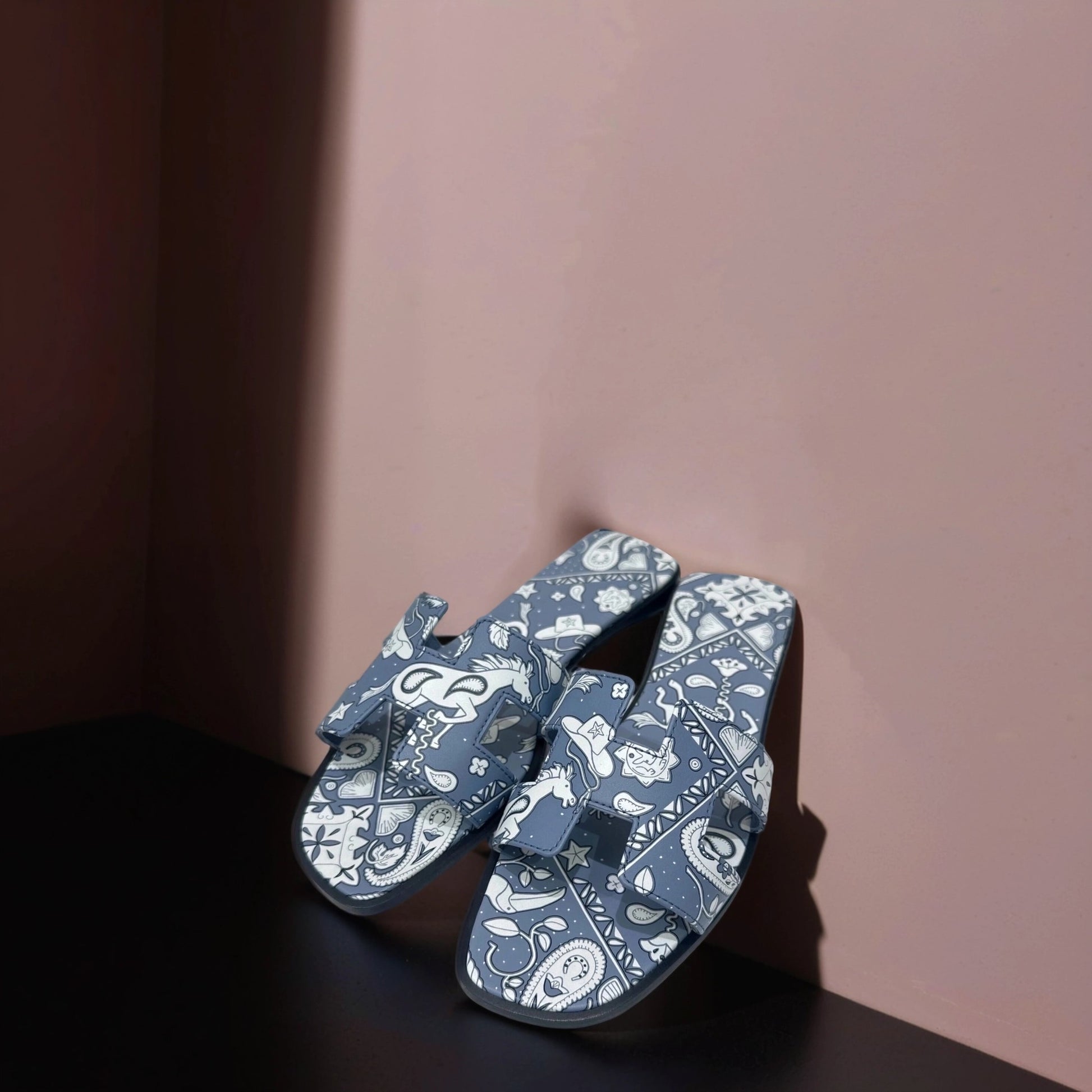 This is an authentic pair of HERMES Box Calfskin Oran Sandals size 38.5 in blue. These stylish slippers are crafted of calfskin leather in blue and white. The toe strap is a cross over large Hermes H with white stitching.