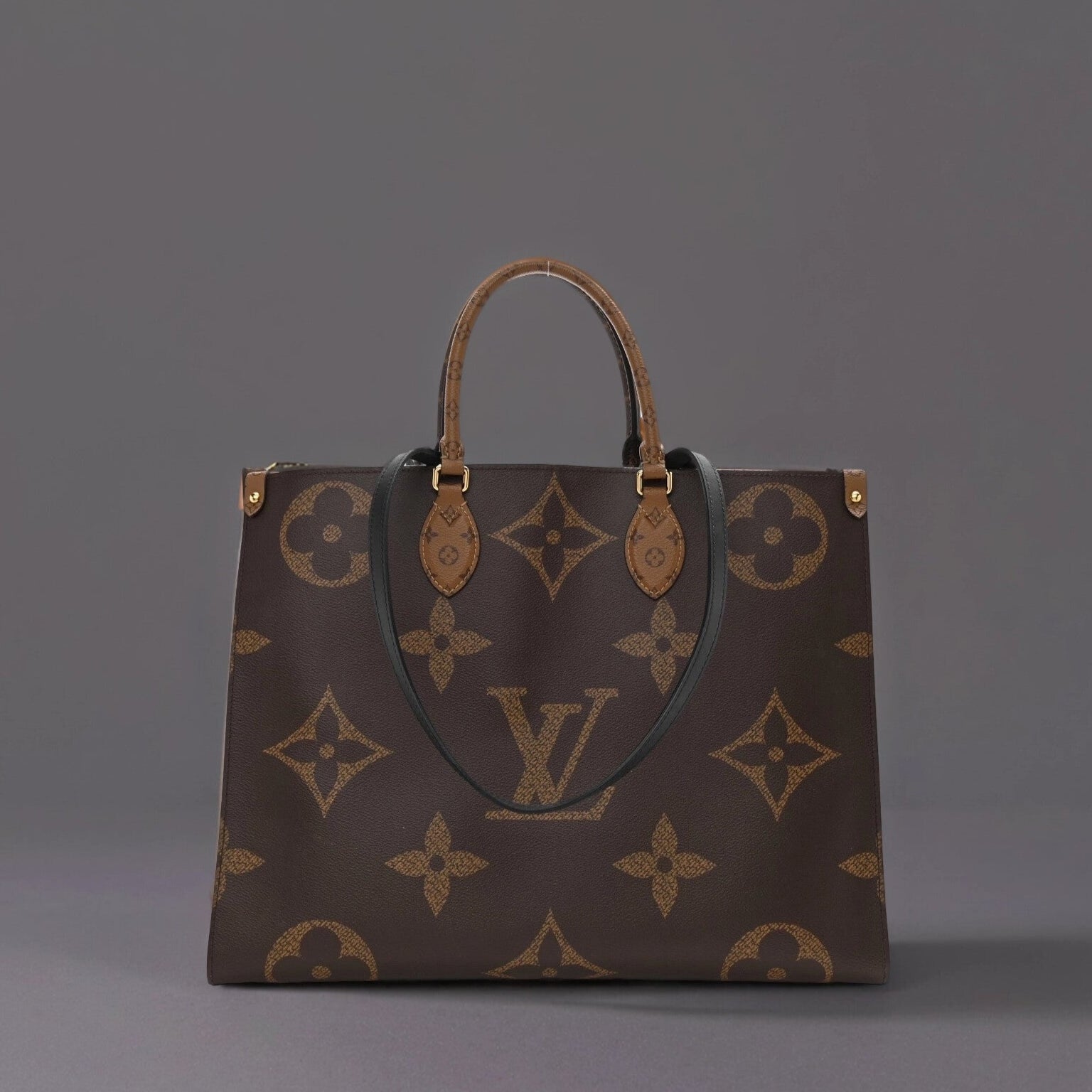 We guarantee this is an authentic LOUIS VUITTON Reverse Monogram Giant Onthego GM or 100% of your money back. This limited edition tote features oversized and smaller sized versions of the classic Louis Vuitton monogram printed in brown on coated canvas in beige. The bag features rolled top handles and long shoulder straps that can be tucked away inside the bag, accented with polished brass hardware. The top is open to a spacious red fabric interior with zipper and patch pockets. This is a gorgeous tote with an exceptional look for a day of play, from Louis Vuitton.