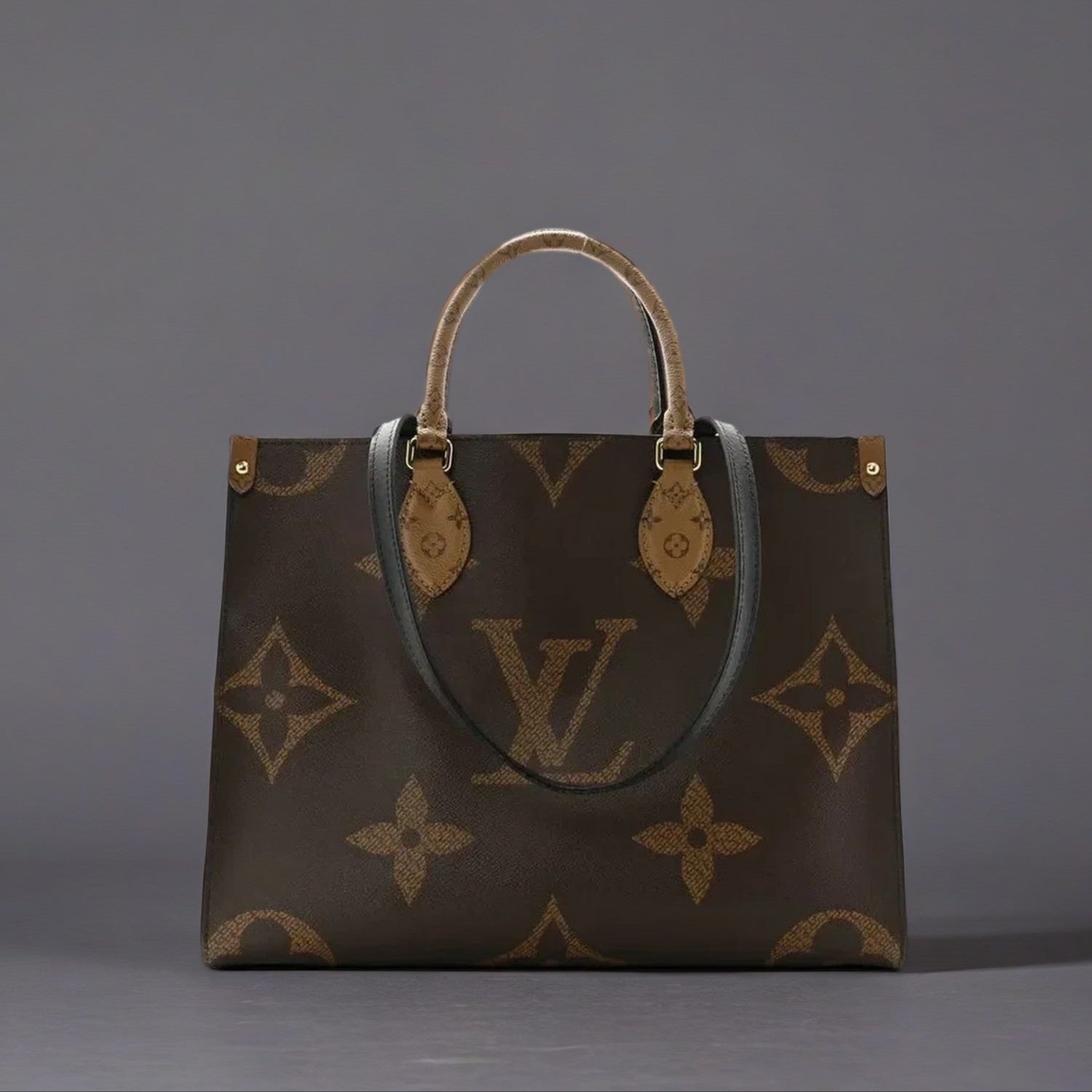 This is an authentic LOUIS VUITTON Reverse Monogram Giant Onthego MM. This limited edition tote features oversized and smaller versions of the classic Louis Vuitton monogram printed in brown on coated canvas in beige. The bag features rolled top handles and long shoulder straps that can be tucked away inside the bag, accented with polished brass hardware. The top is open to a spacious red fabric interior with zipper and patch pockets.