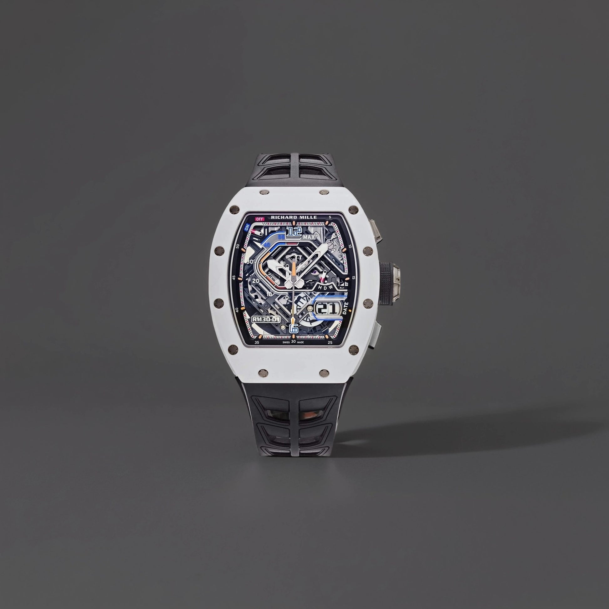 Richard Mille RM 30-01 White Ceramic Automatic Watch. A bold fusion of innovation and design, featuring a lightweight 50 x 42.7 mm white ceramic case and skeletonized dial showcasing the signature Declutchable Rotor system for optimized performance. Powered by the Caliber RMAR2 with a 55-hour power reserve, it combines precision, durability, and modern elegance. Finished with a white rubber strap and titanium buckle — a true statement of Richard Mille’s technical mastery.