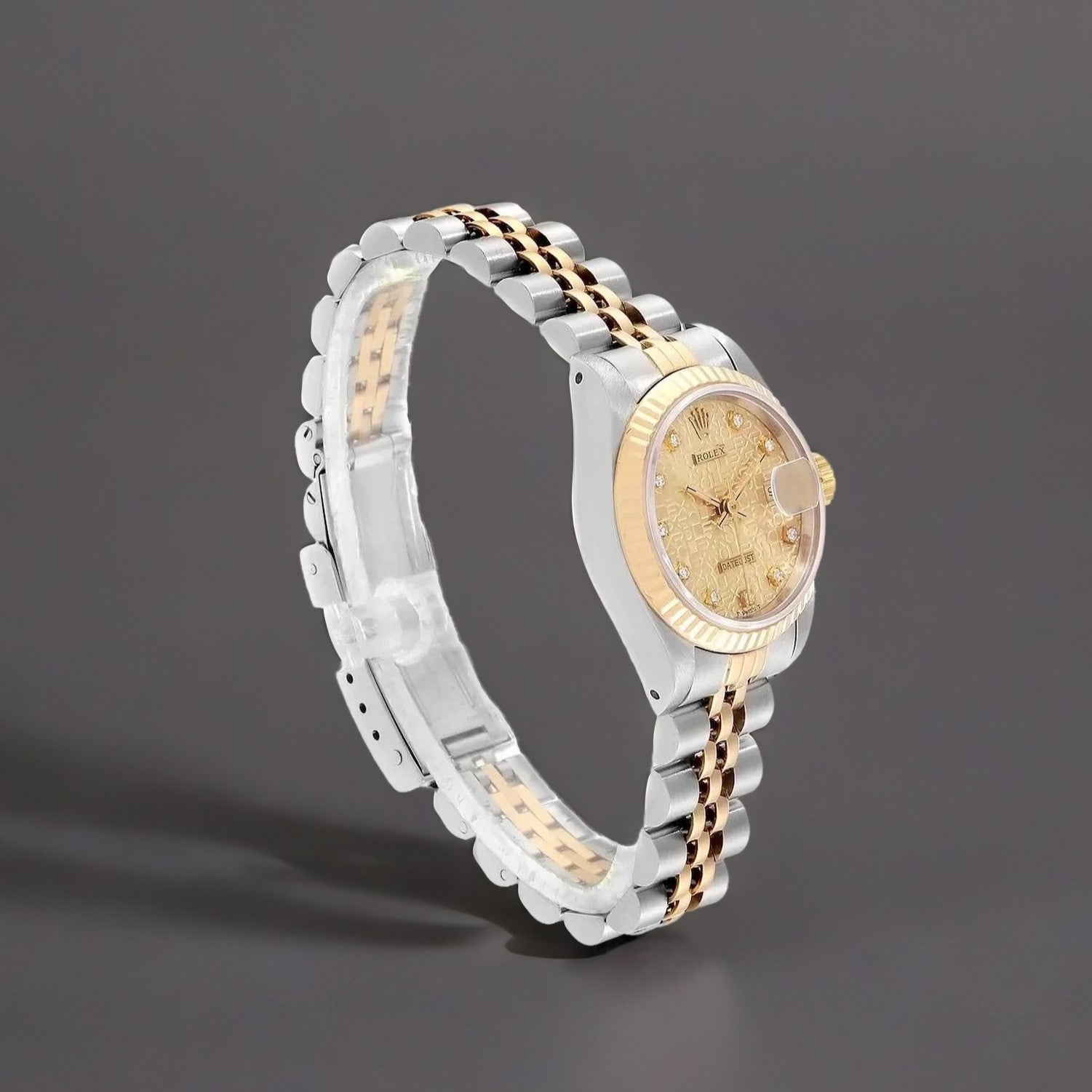 Rolex Datejust 26 Steel Yellow Gold Diamond Dial Ladies Watch. Stainless steel oyster case 26 mm in diameter. Rolex logo on a crown. 18k yellow gold fluted bezel. Scratch resistant sapphire crystal with cyclops magnifier. Champagne jubilee anniversary dial with original Rolex factory diamond hour markers. Date calendar at 3 o'clock aperture. Stainless steel and 18k yellow gold jubilee bracelet with fold over clasp.