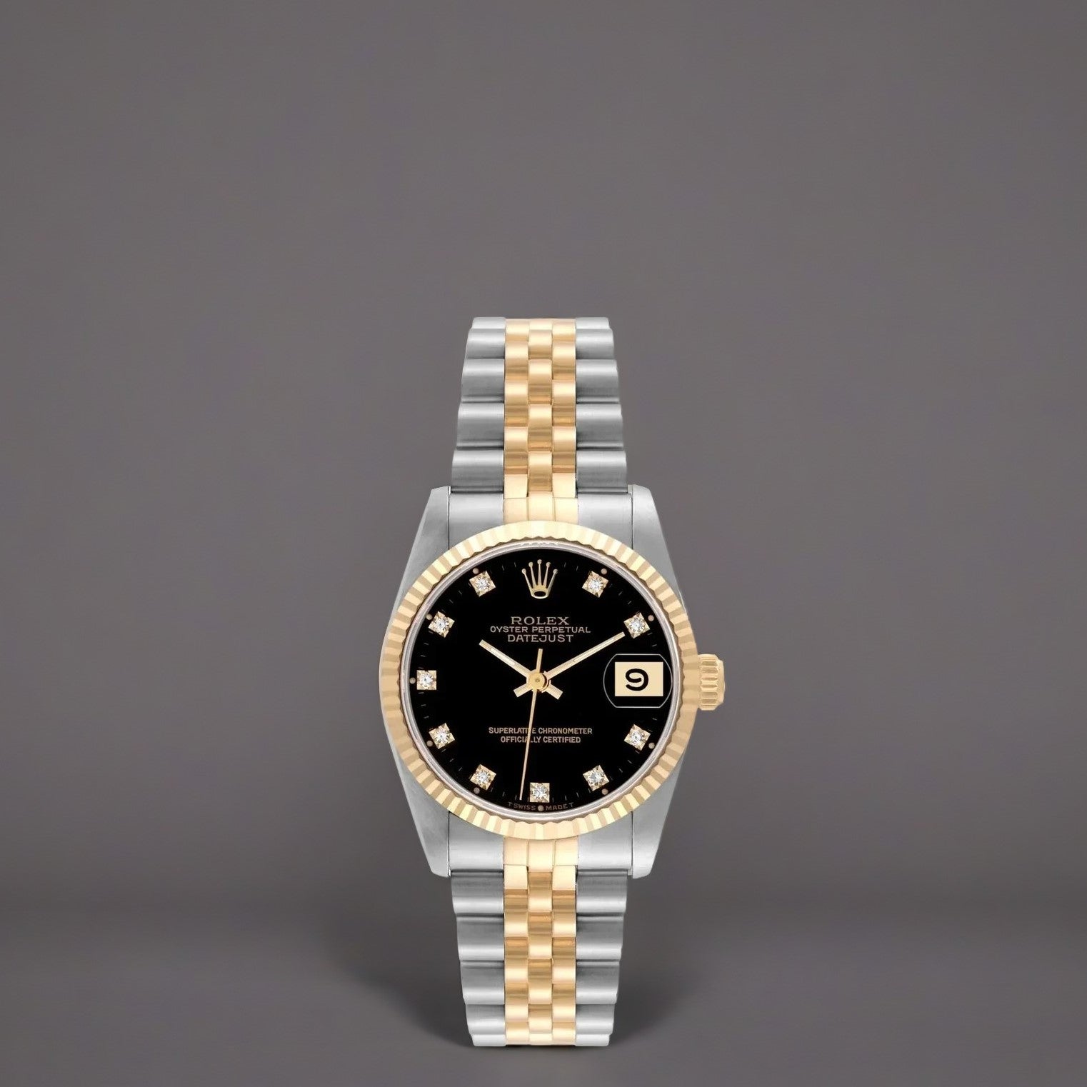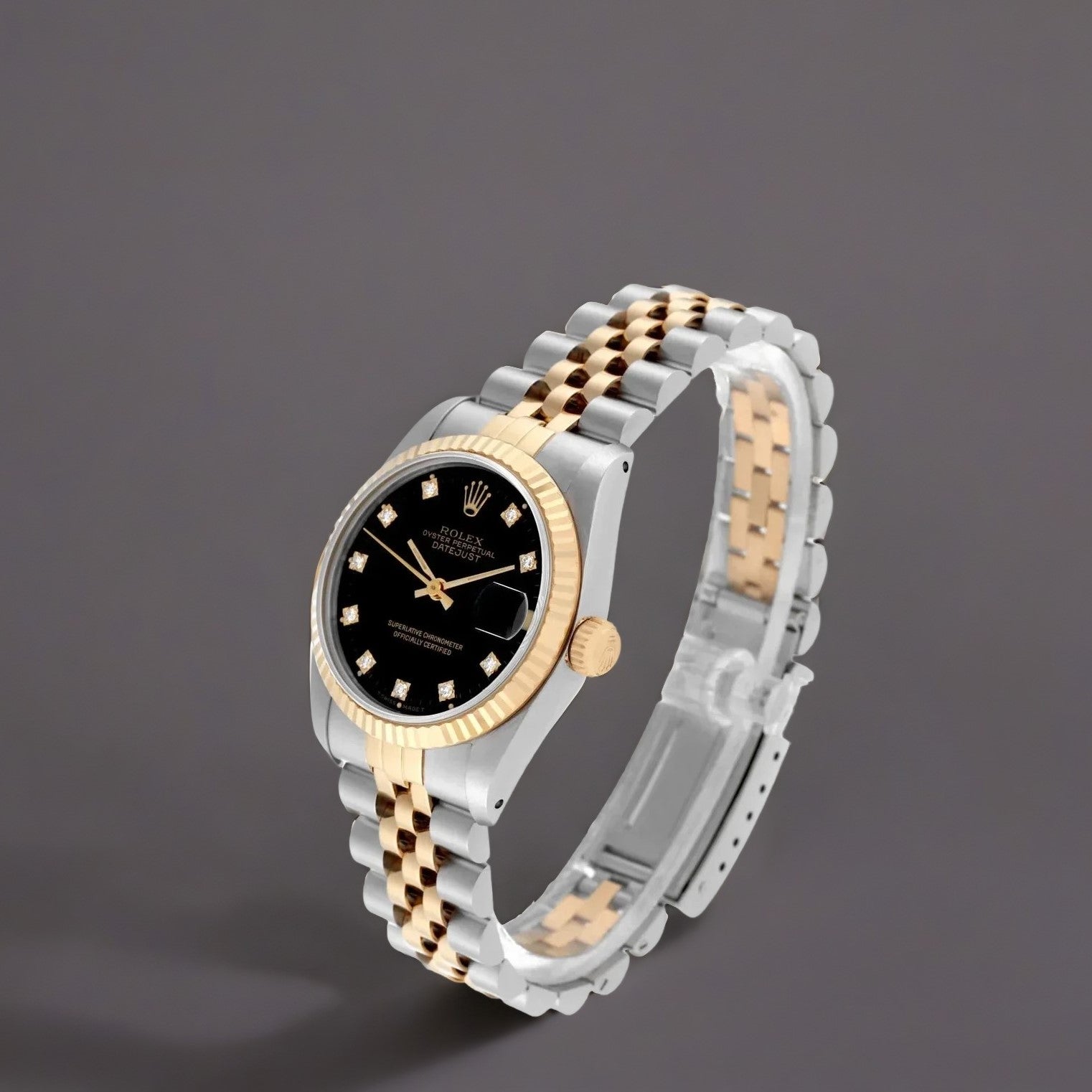 Rolex Datejust Midsize Diamond Steel Yellow Gold Ladies Watch. Stainless steel oyster case 31 mm in diameter. Rolex logo on an 18k yellow gold crown. 18k yellow gold fluted bezel. Scratch resistant sapphire crystal with cyclops magnifier. Black dial with original Rolex factory diamond hour markers. Date calendar at 3 o'clock aperture. Stainless steel and 18k yellow gold jubilee bracelet with fold over clasp.