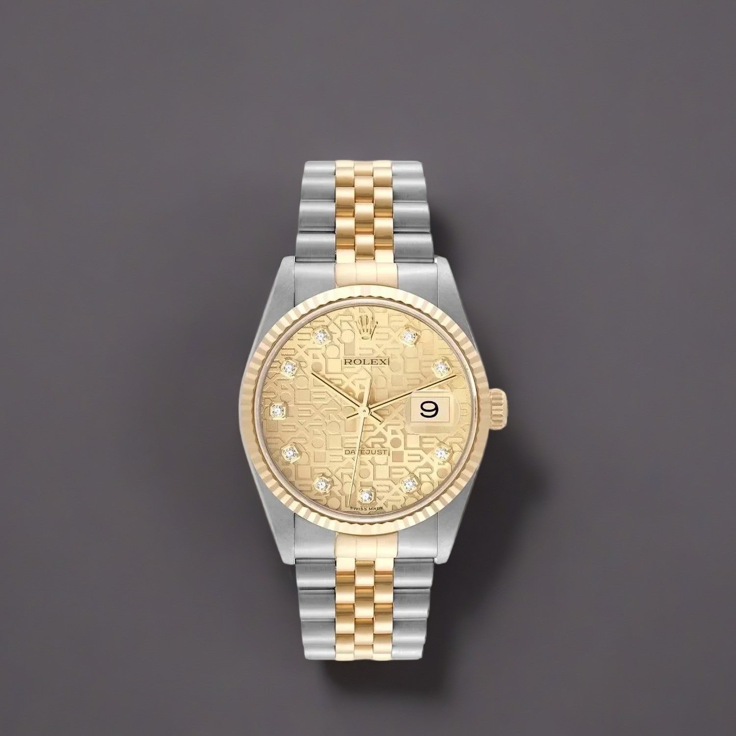 Rolex Datejust Stainless Steel Yellow Gold Watch . Stainless steel case 36.0 mm in diameter. Rolex logo on an 18K yellow gold crown. 18k yellow gold fluted bezel. Scratch resistant sapphire crystal with cyclops magnifier. Champagne anniversary jubilee dial with original Rolex factory diamond hour markers and yellow gold hands. Date window at 3 o'clock aperture. Stainless steel and 18k yellow gold jubilee bracelet with fold over clasp.