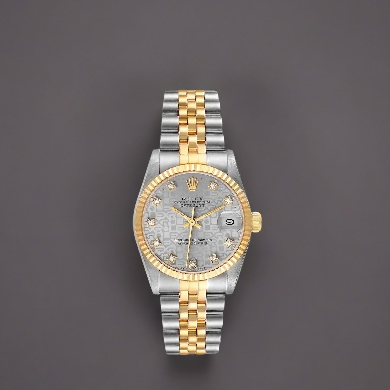 Rolex Datejust Midsize Steel Yellow Gold Diamond Dial Ladies Watch. Stainless steel oyster case 31 mm in diameter. Rolex logo on an 18K yellow gold crown. 18k yellow gold fluted bezel. Scratch resistant sapphire crystal with cyclops magnifier. Silver jubilee anniversary dial with original Rolex factory diamond hour markers. Date calendar at 3 o'clock aperture. Stainless steel and 18k yellow gold jubilee bracelet with fold over clasp.