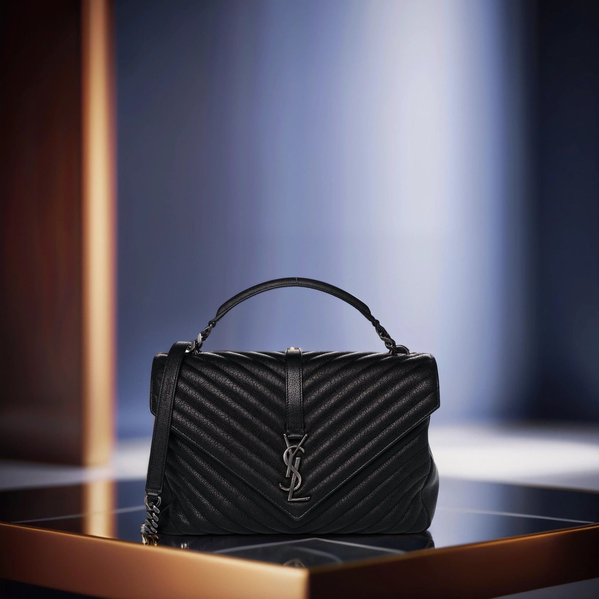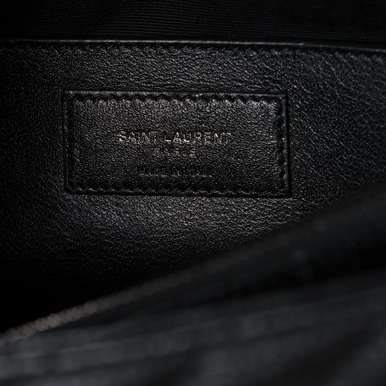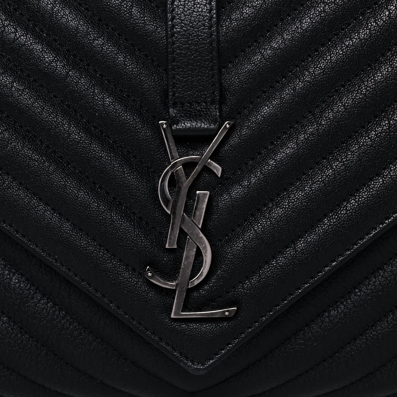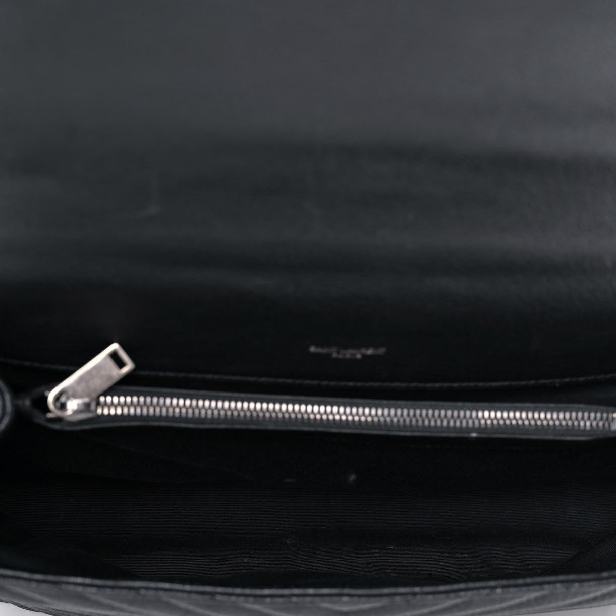This is an authentic SAINT LAURENT Sheepskin Matelasse Chevron Monogram Large College Satchel in Black. This shoulder tote is crafted of black chevron-quilted sheepskin leather. The bag features a rear patch pocket, an optional aged silver bijoux chain shoulder strap with a leather shoulder pad, a sturdy top handle, and a front flap with a prominent aged silver YSL monogram detail. This opens to a partitioned black fabric and leather interior with a patch pocket and a zipper compartment.