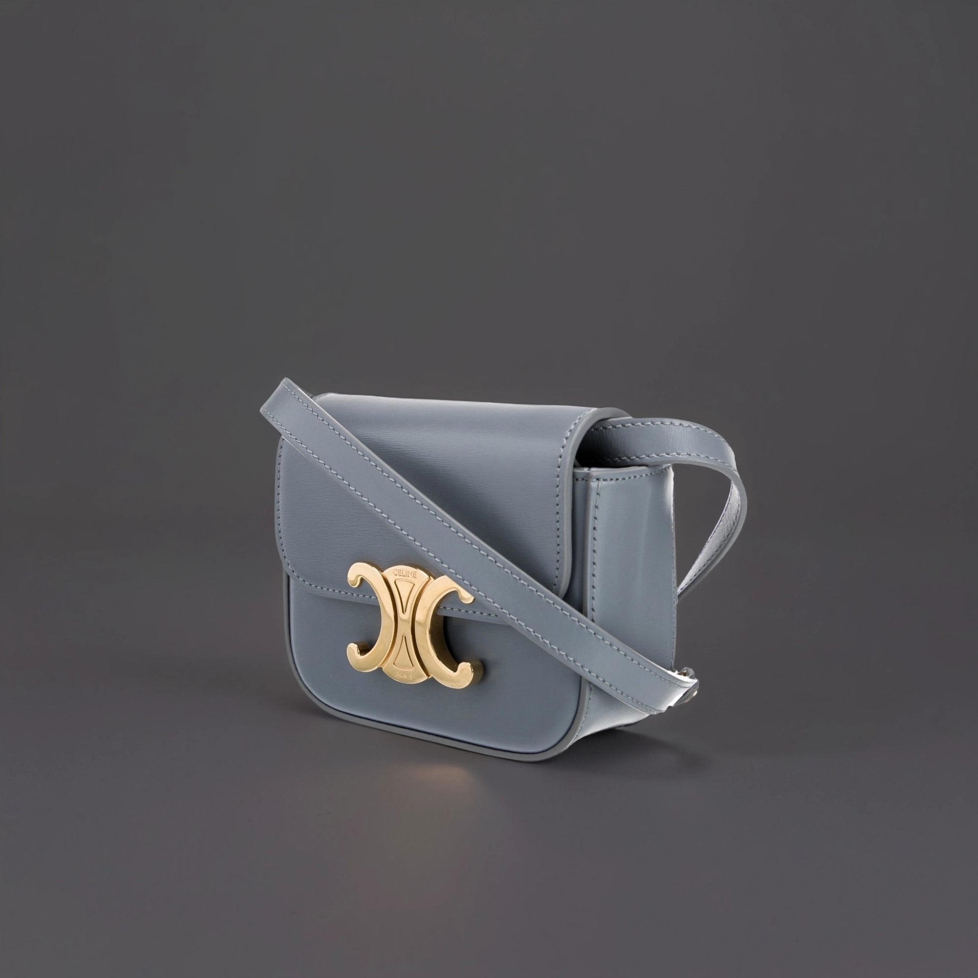 This is an authentic CELINE Shiny Calfskin Mini Triomphe in Blue Grey. This chic shoulder bag is crafted of calfskin leather in Blue Grey. The bag features an adjustable leather shoulder strap, gold hardware, and a gold snap lock. This opens to a white leather interior with a patch pocket.