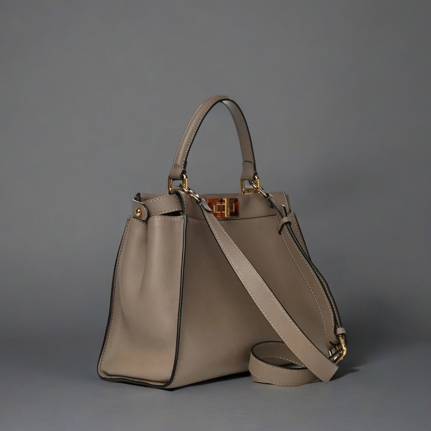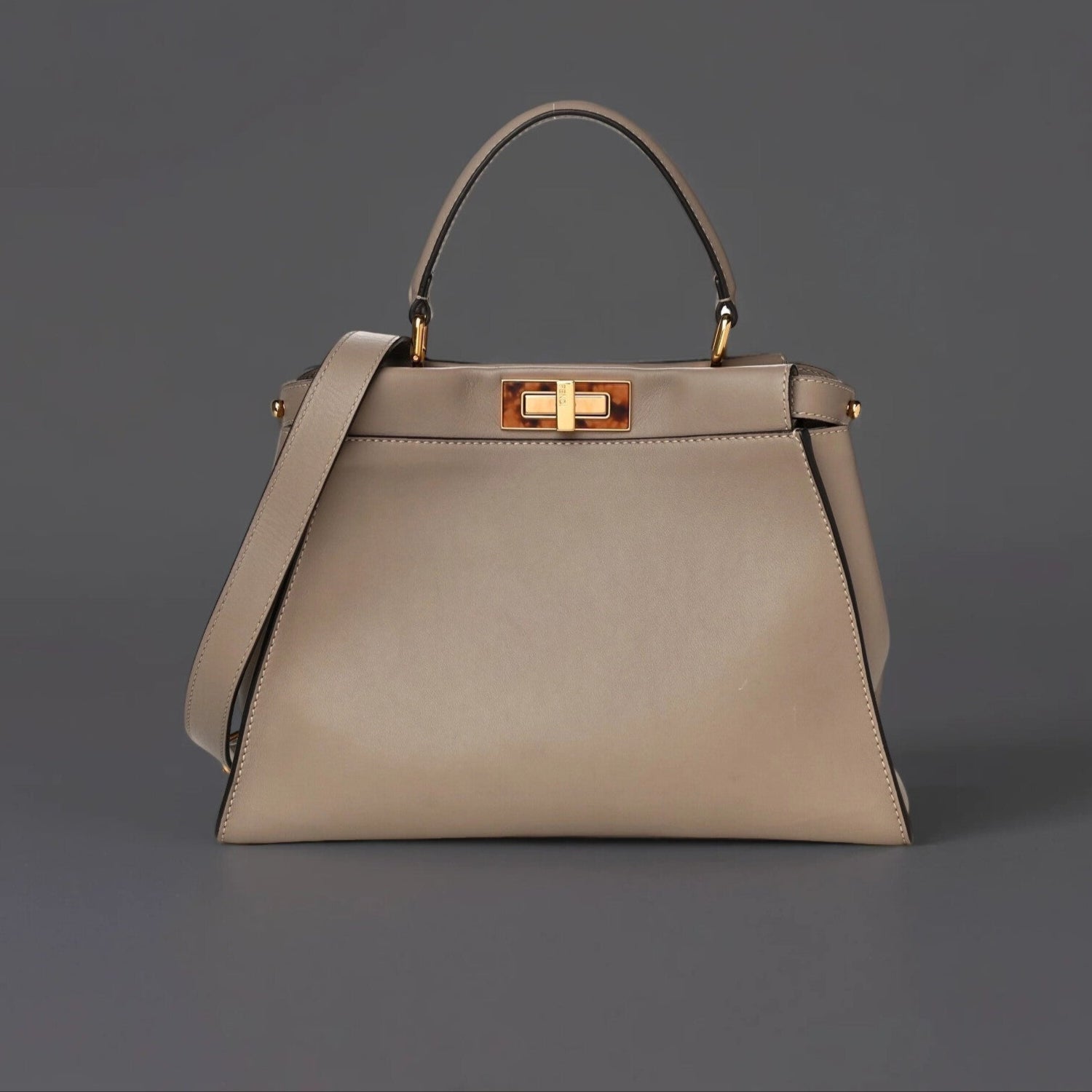 We guarantee this is an authentic FENDI Silk Calfskin Plexi Tortoise Medium Peekaboo Iconic Satchel Dove or 100% of your money back. This chic tote is finely crafted of taupe calfskin leather. This medium-sized bag features gold and tortoise squared turn locks on either side that when released, relax the outer layer to reveal the inner panel of a brown microfiber interior with a zipper pocket. The handbag can be carried as a shoulder bag with the optional adjustable strap or as a tote by the inner handle.