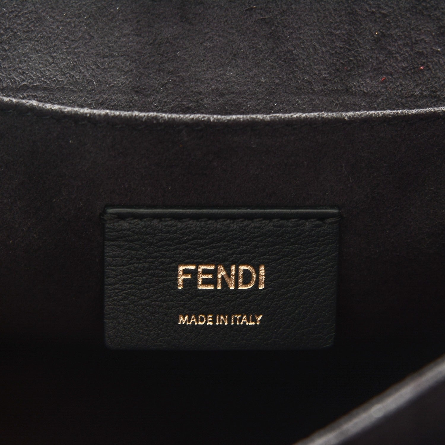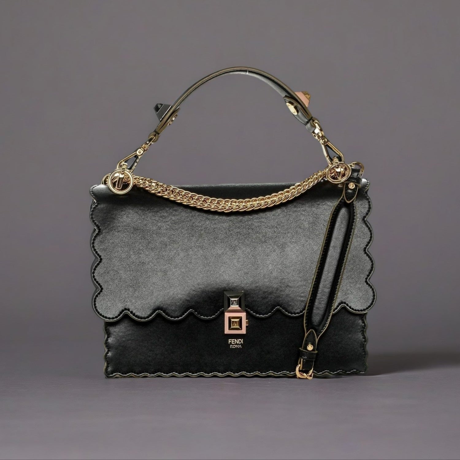 We guarantee this is an authentic FENDI Smooth Calfskin Scalloped Studded Kan I without a strap Shoulder Bag Black or 100% of your money back. This chic top handle bag is crafted of calfskin leather in black. The shoulder bag features contrasting scalloped edging, a detachable leather top handle and polished gold shoulder strap, a front flap with a double multicolored plexiglass stud closure. This opens to a partitioned black suede leather interior with small patch pocket for daytime or evening wear, from Fendi.