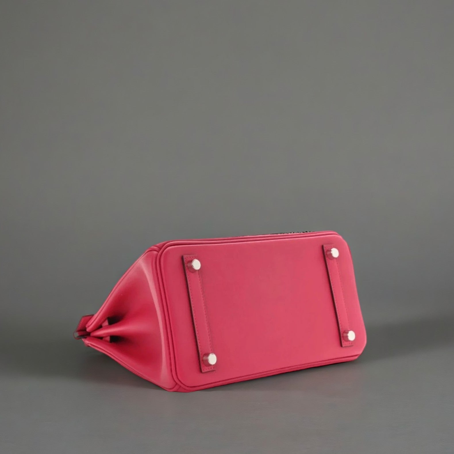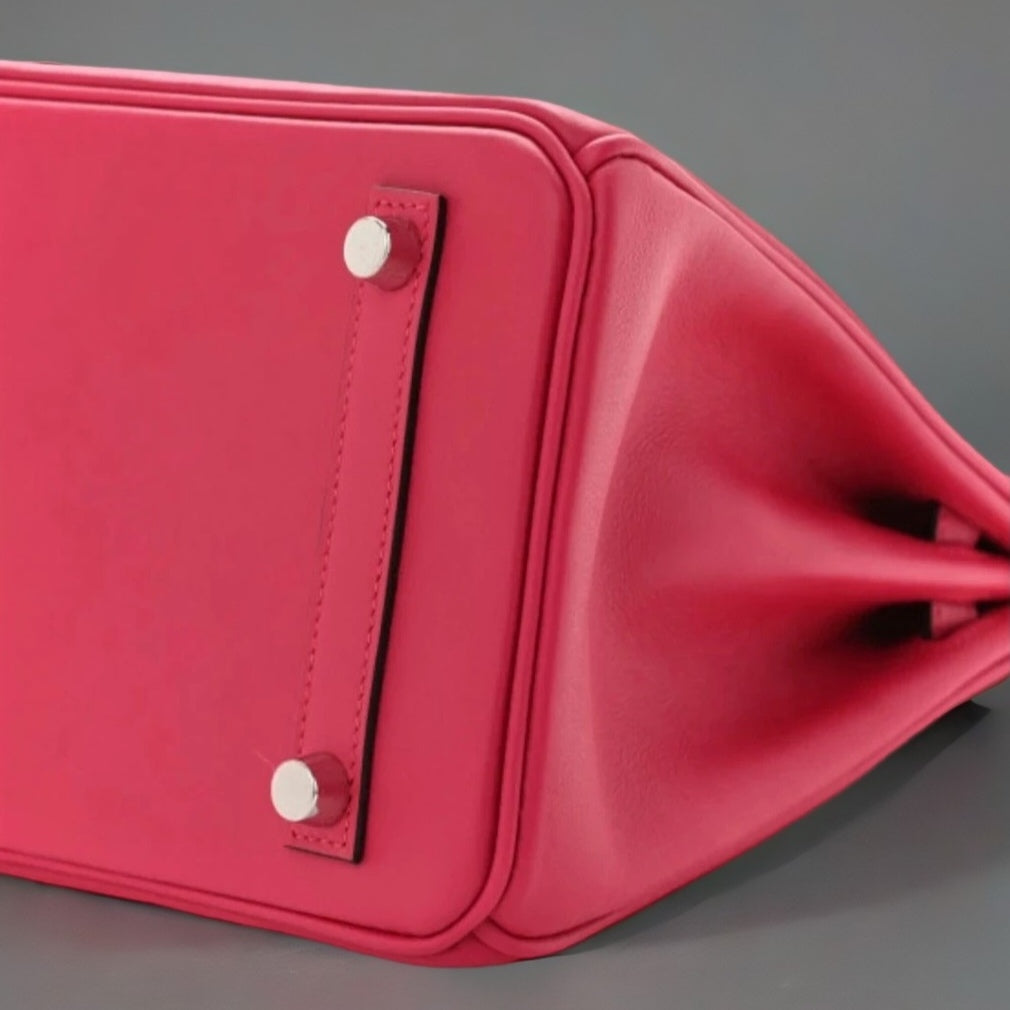 This is an authentic HERMES Swift Birkin 25 in Framboise. This classic handbag is beautifully crafted of supple swift leather with a fine grain in pink. The bag features rolled leather top handles, a frontal flap and strap closure and palladium plated hardware including a turn lock and keys in the clochette. This opens to a matte leather interior with zipper and patch pockets.