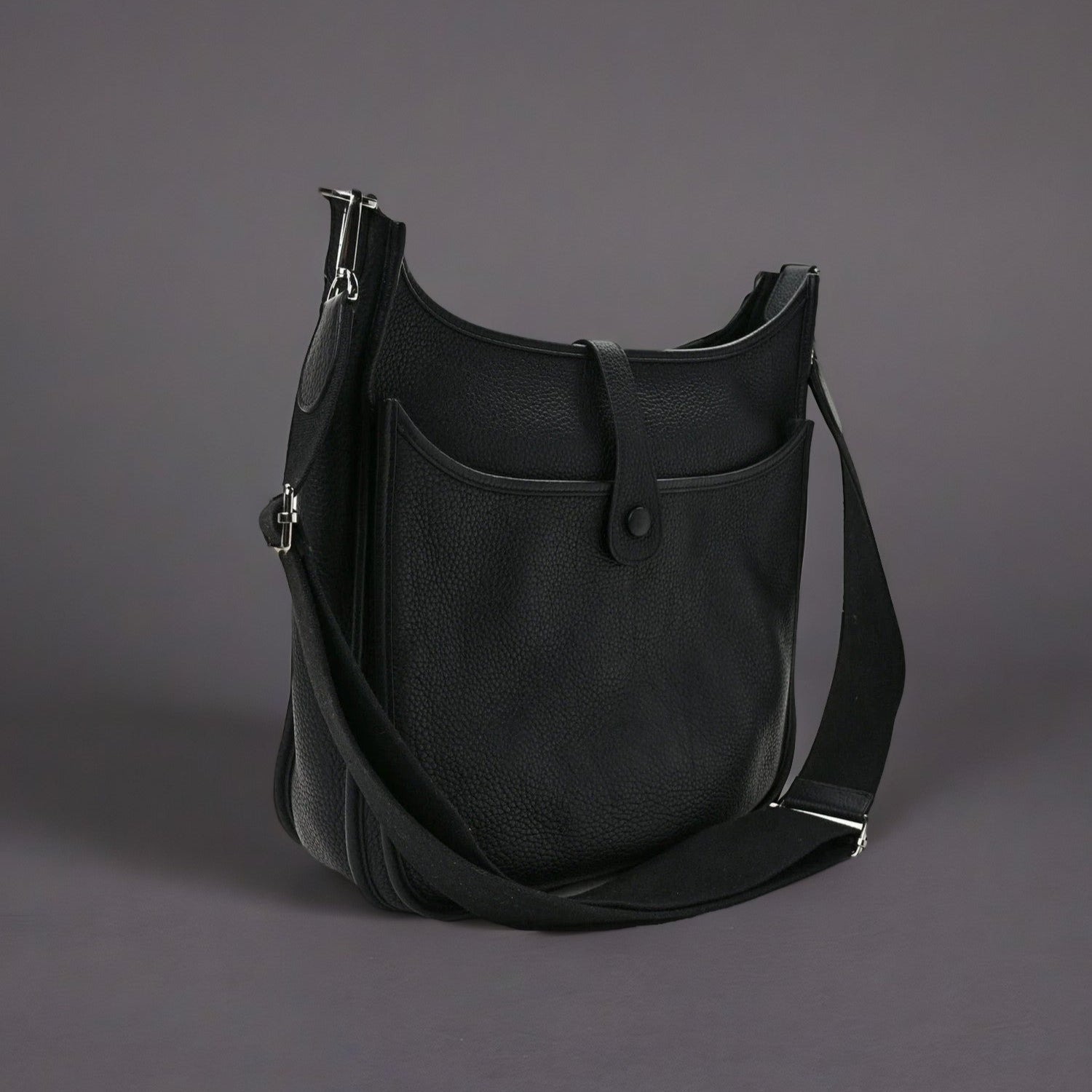 This is an authentic HERMES Taurillon Clemence Evelyne III GM in Black. This cross-body messenger bag is crafted of clemence pebbled calfskin leather. This popular shoulder bag features an adjustable canvas shoulder strap, a rear pocket, palladium silver hardware and a perforated Hermes H oval on the front. The top of the bag opens with a cross over strap to a suede interior.