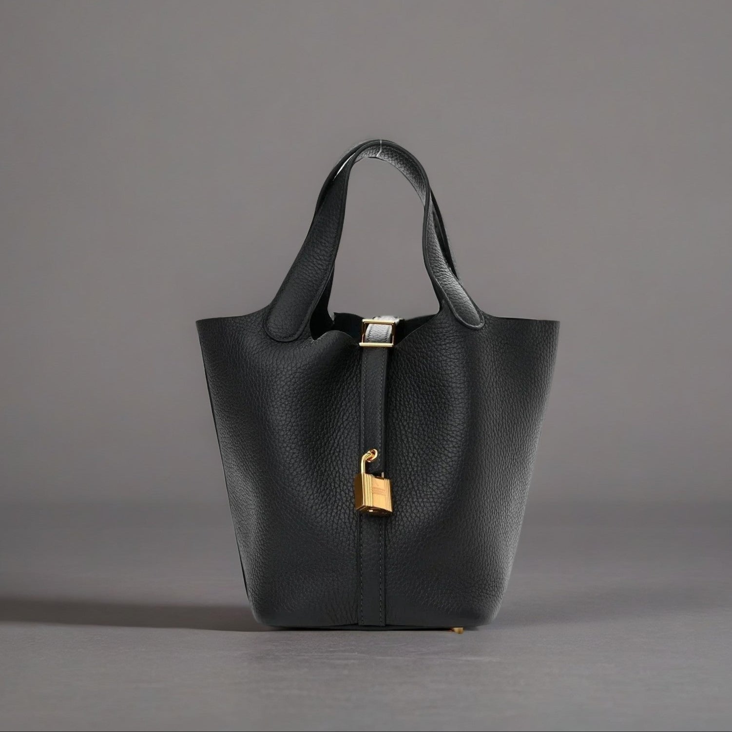 This is an authentic HERMES Taurillon Clemence Picotin Lock 18 PM in Black. This tote is crafted of soft taurillon clemence calfskin leather in black with polished gold plated hardware. This tote is a one-piece handbag with strap handles that extend from the sides with an extra layer of leather for support. The bag opens to a matching black suede interior with a leather base.
