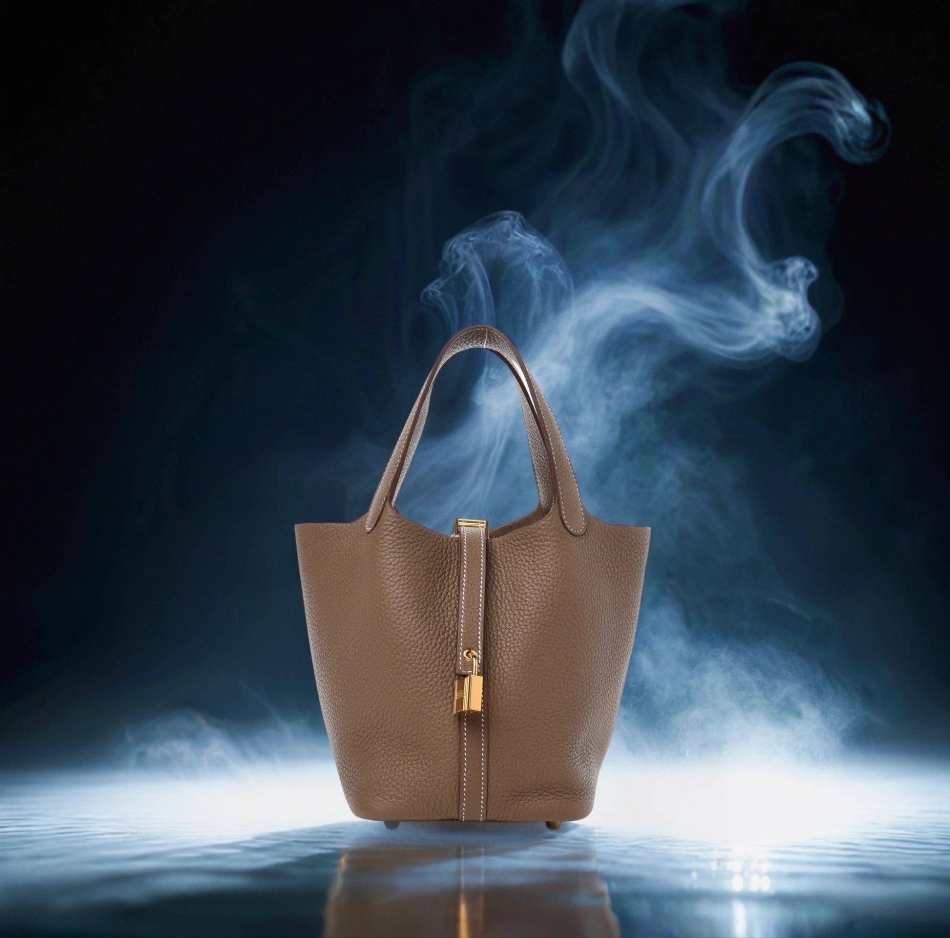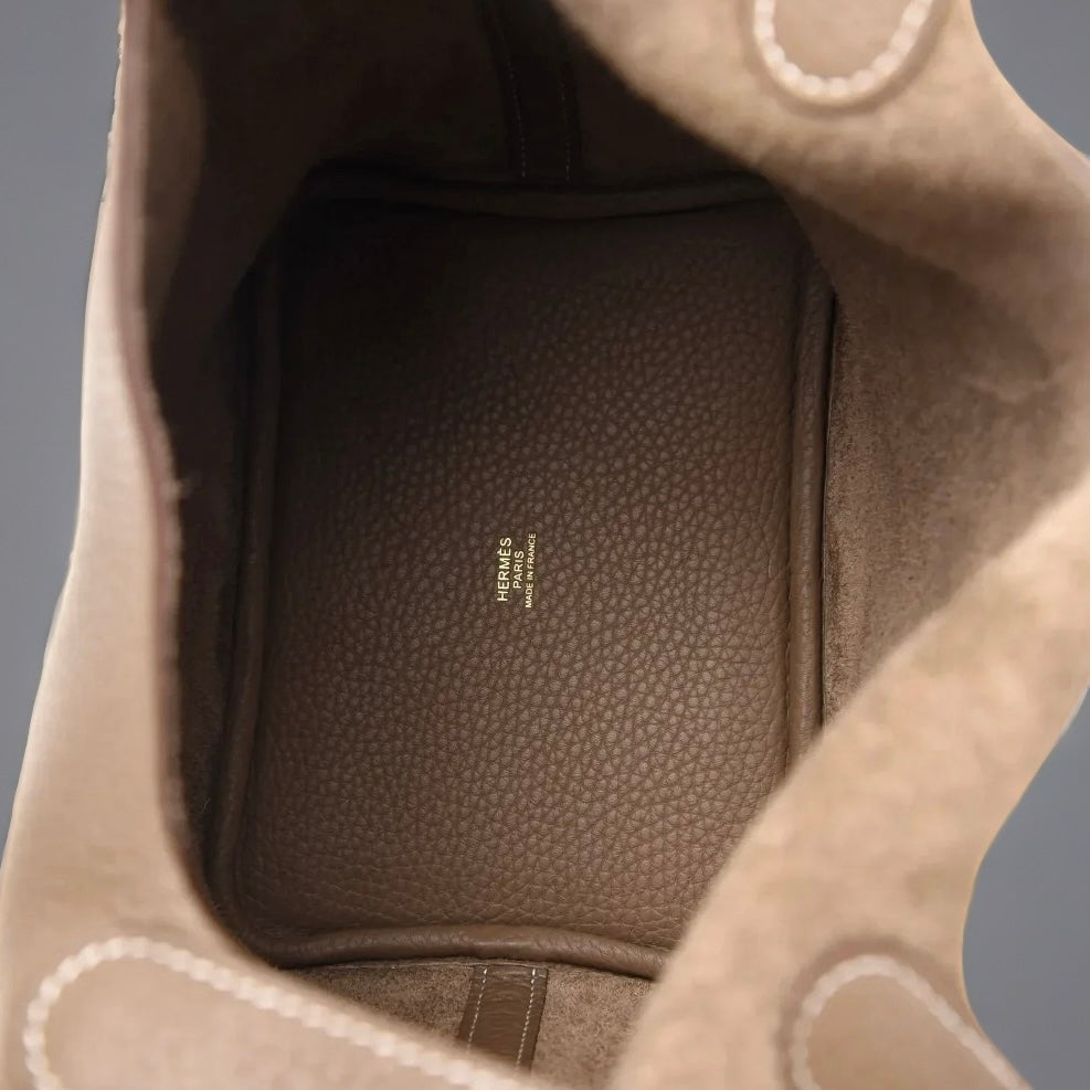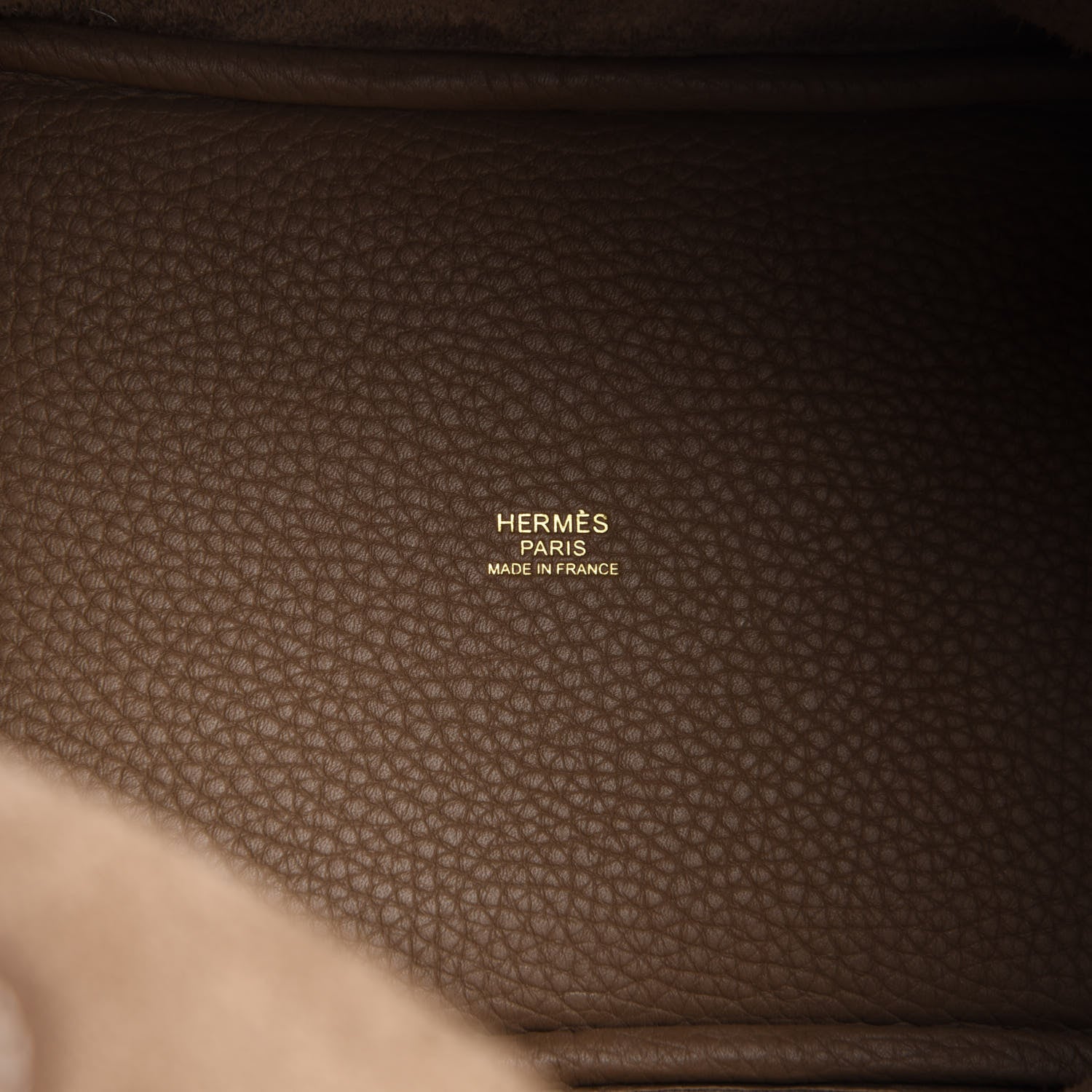 This is an authentic HERMES Taurillon Clemence Picotin Lock 18 PM in Etoupe. This stunning tote is crafted of luxurious Clemence calfskin leather in taupe and features gold plated hardware. The bag has a unique one-piece reinforced design with leather top handles and a thin crossover strap. The top opens to a suede and chevre goatskin leather interior.