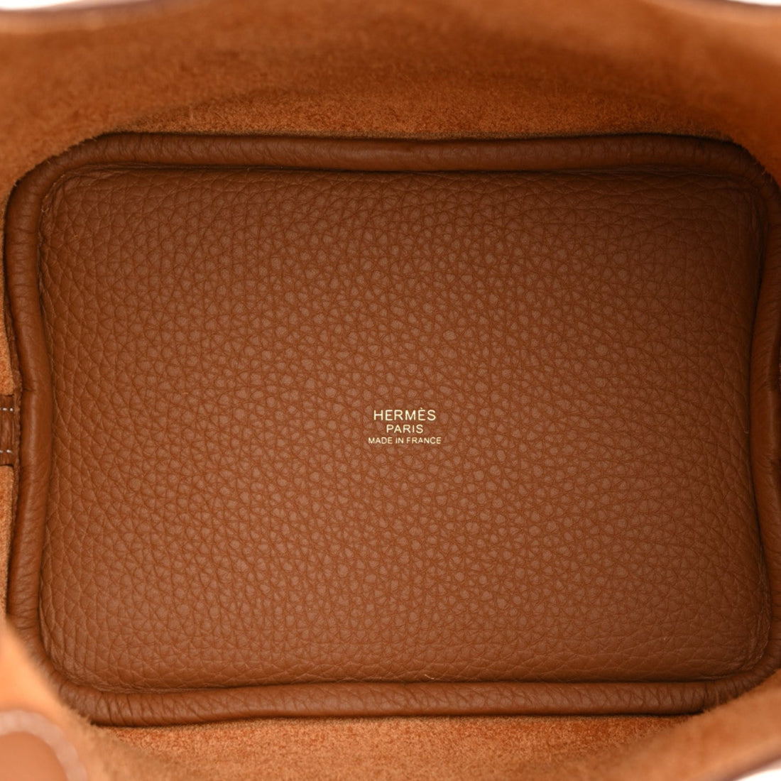 This is an authentic HERMES Taurillon Clemence Picotin Lock 18 PM in Gold. This chic tote is crafted of textured Clemence calfskin leather in brown. This bucket-style bag features a unique one-piece reinforced design with leather top handles and a closure strap that can be secured by a polished gold padlock. This opens to a brown suede interior.