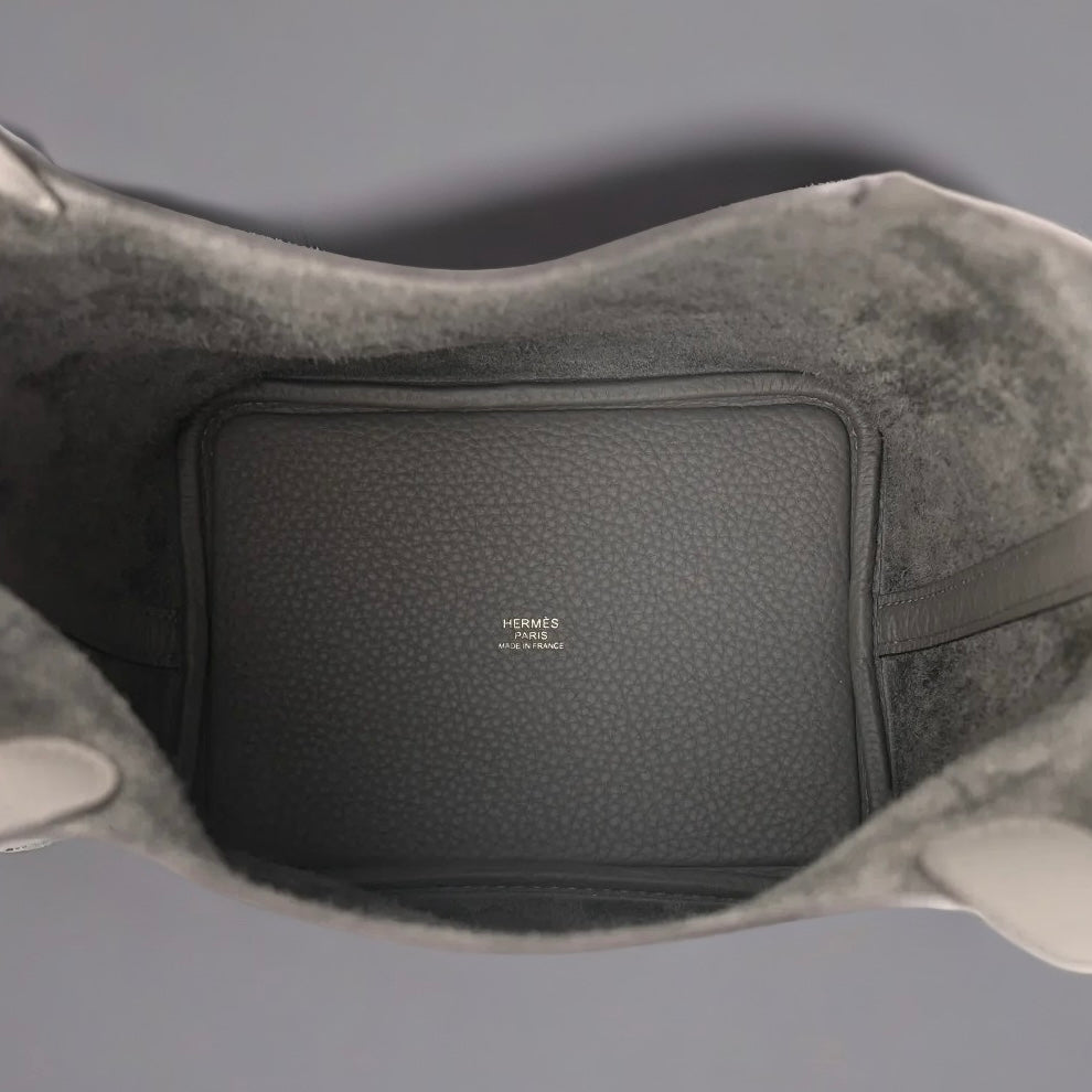 This is an authentic HERMES Taurillon Clemence Picotin Lock 18 PM in Gris Meyer. This chic tote is crafted of soft taurillon clemence calfskin leather in grey. This bucket style bag features a unique one-piece reinforced design with leather top handles and a closure strap that can be secured by a polished gold padlock. The top is open to a spacious suede interior.