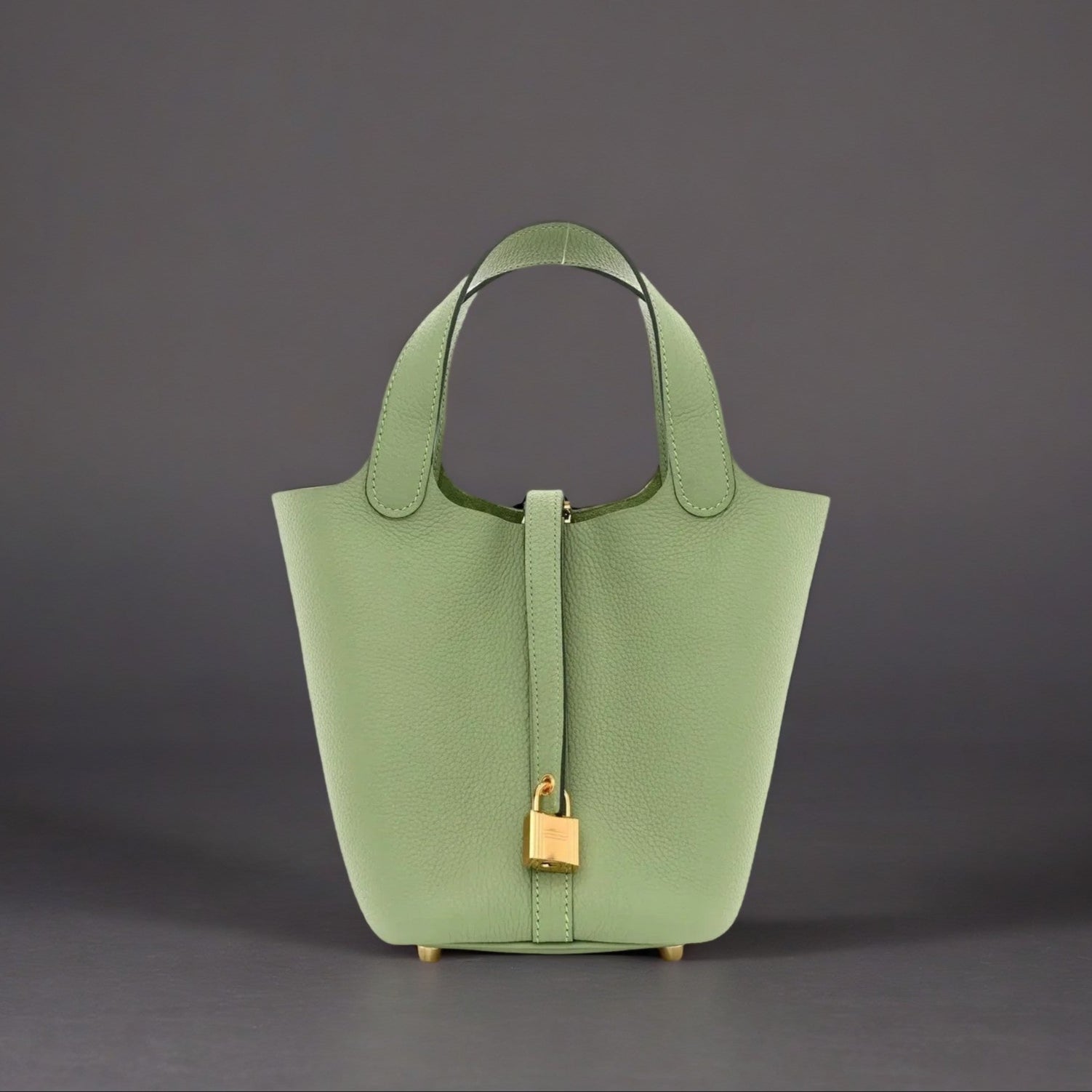 This is an authentic HERMES Taurillon Clemence Picotin Lock 18 PM in Vert Criquet. This chic tote is crafted of soft taurillon calfskin leather in green. This bucket style bag features a unique one piece reinforced design with leather top handles and a closure strap that can be secured by a polished gold plated padlock.