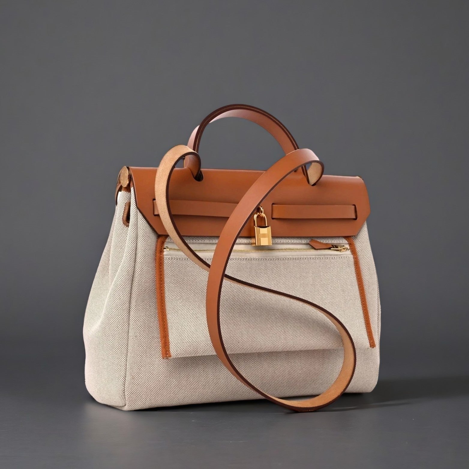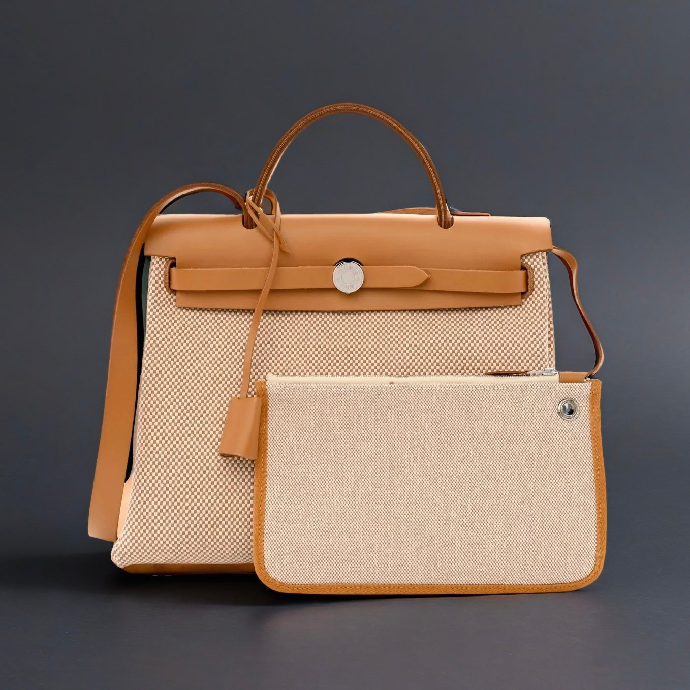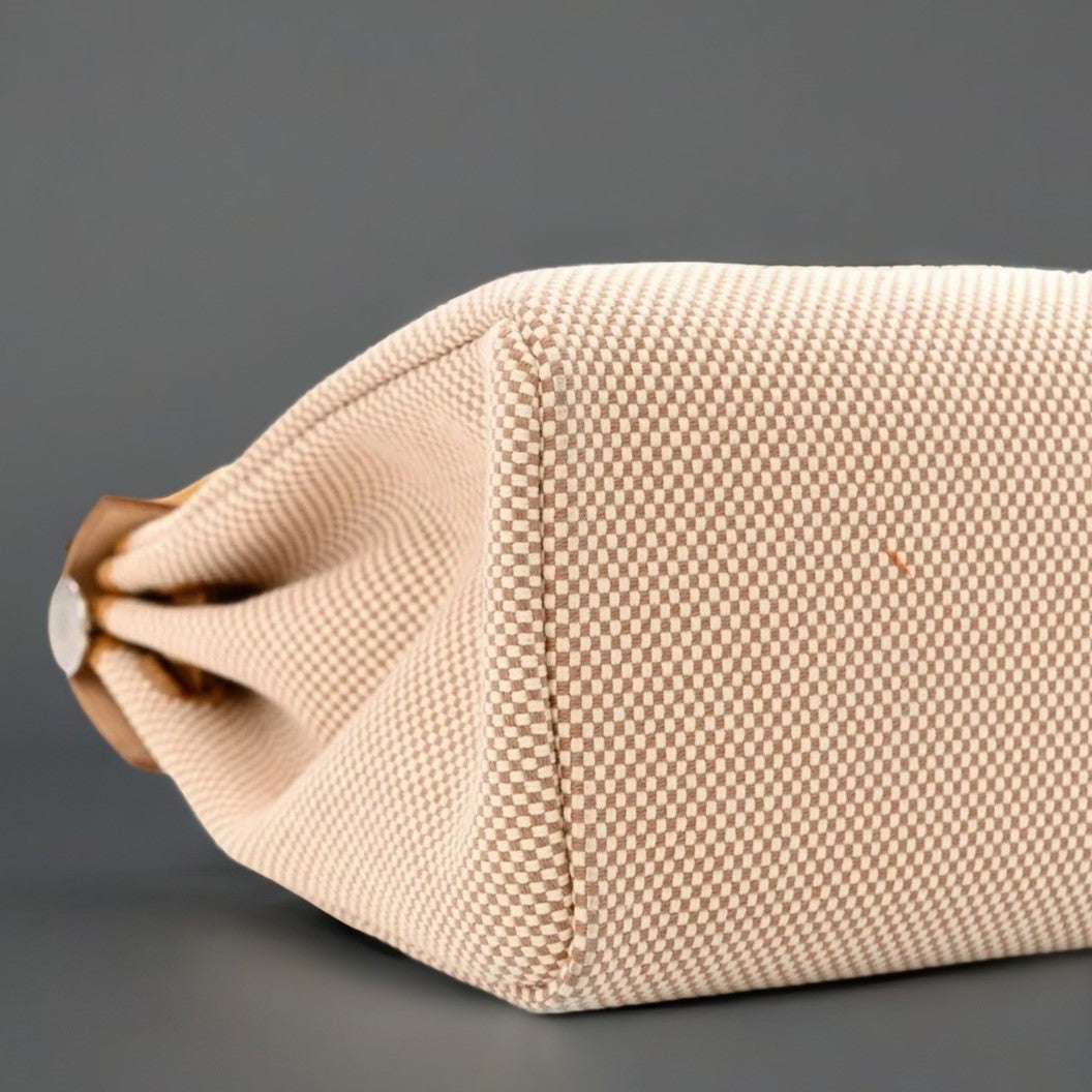 This is an authentic HERMES Vache Hunter Criss Viking Herbag Zip Retourne 31 PM in Ecru, Beige, and Naturel. This stylish tote is crafted of sturdy toile canvas with a printed beige and white checkered pattern. The handbag features a rear exterior zip pocket, a brown leather top crest with a leather top handle, shoulder strap, and strap closure with palladium silver hardware with a padlock. This opens to a toile canvas interior with a matching removable pouch.